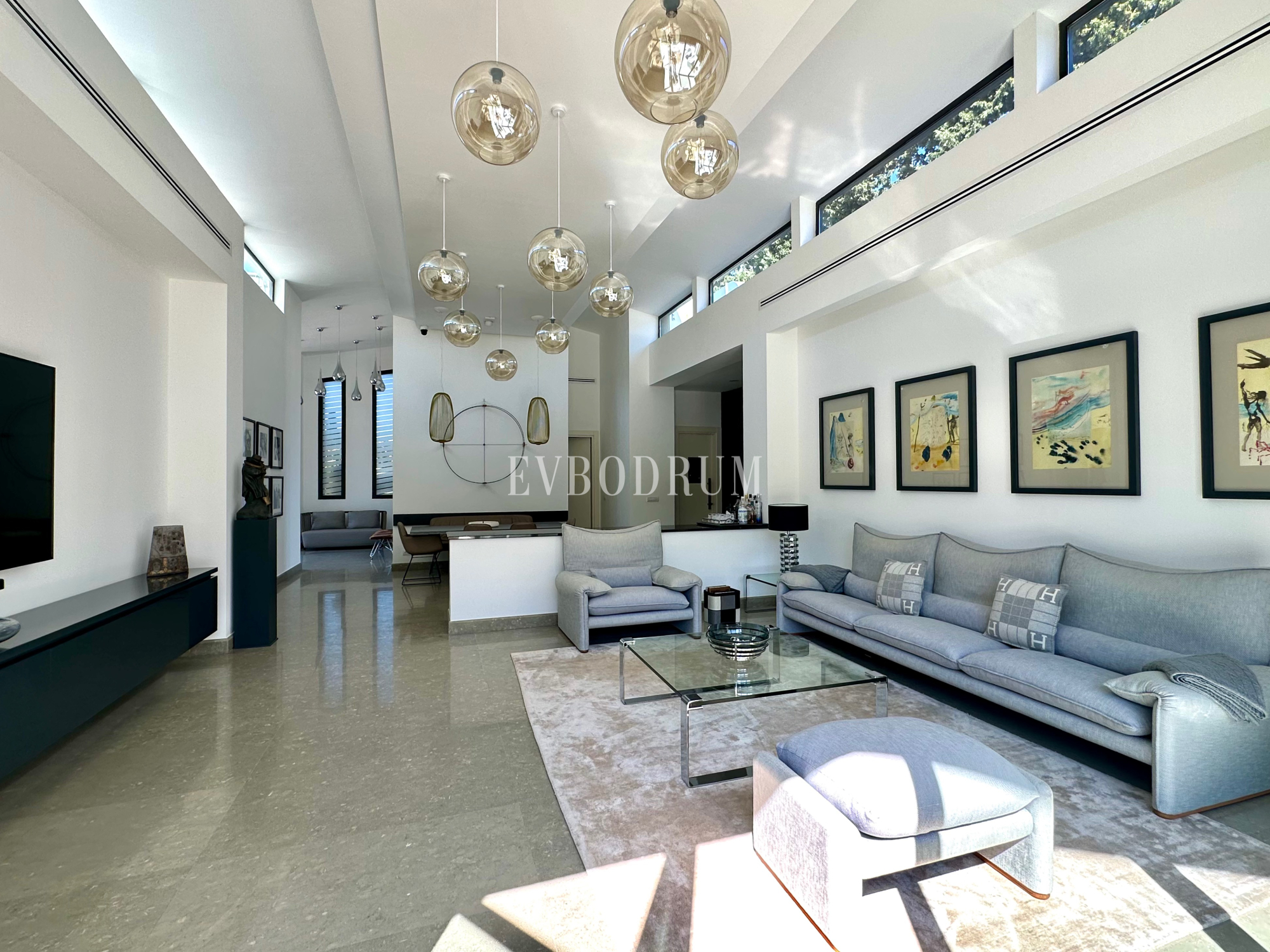 Yüksek tavanlı geniş açık yaşam alanı, buzdolabı, şarap soğutucu, kahve makinesi ile donatılmış servis mutfağı