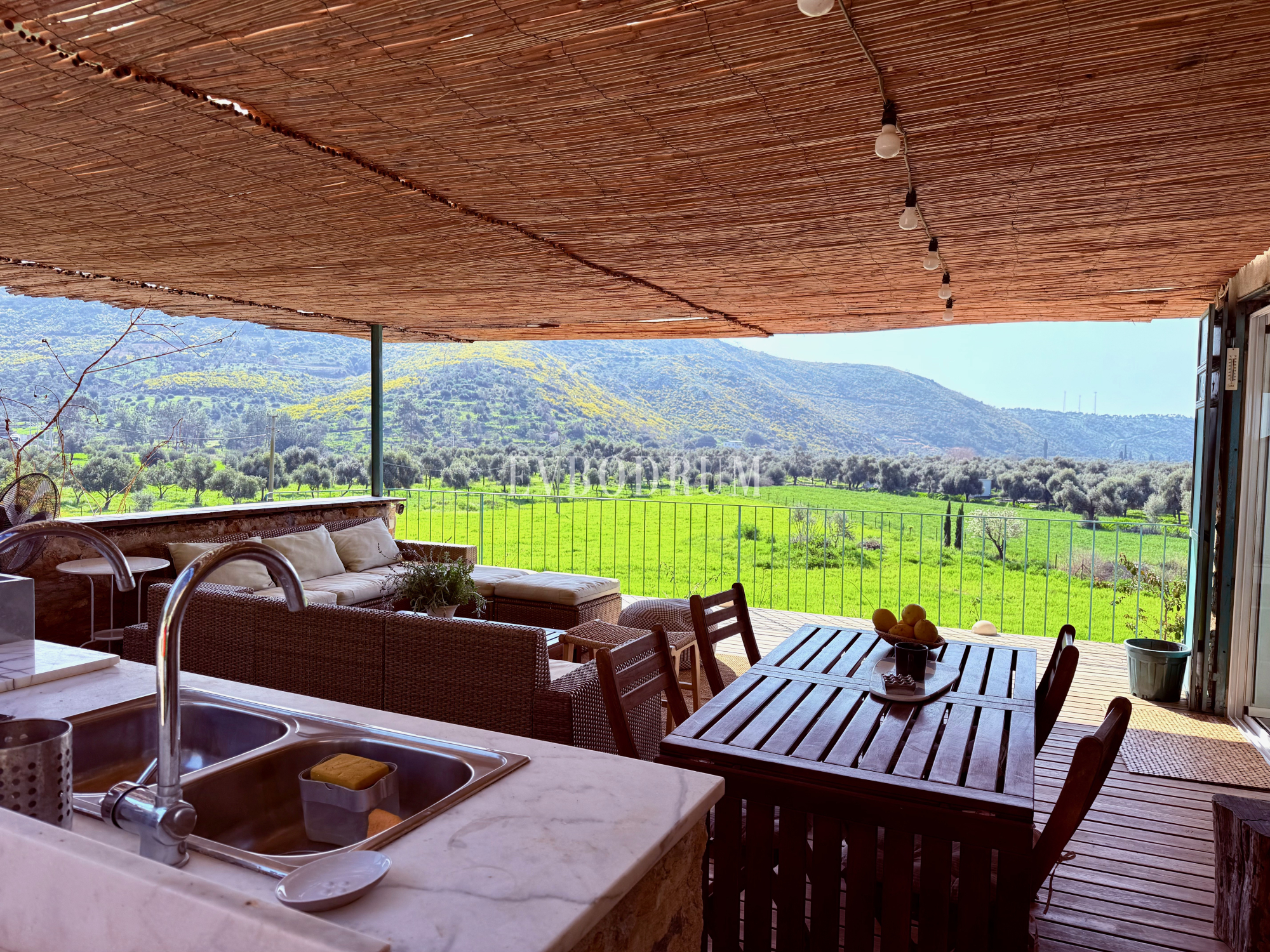 Üst Kat (Ana Yaşam Alanı): Evin kalbi, geniş bir oturma ve yemek alanına sahip terastır. Bu katta ayrıca dış mutfak, salon, bir tek kişilik yatak odası, ebeveyn yatak odası, mutfak ve hamam konseptli bir banyo yer almaktadır.