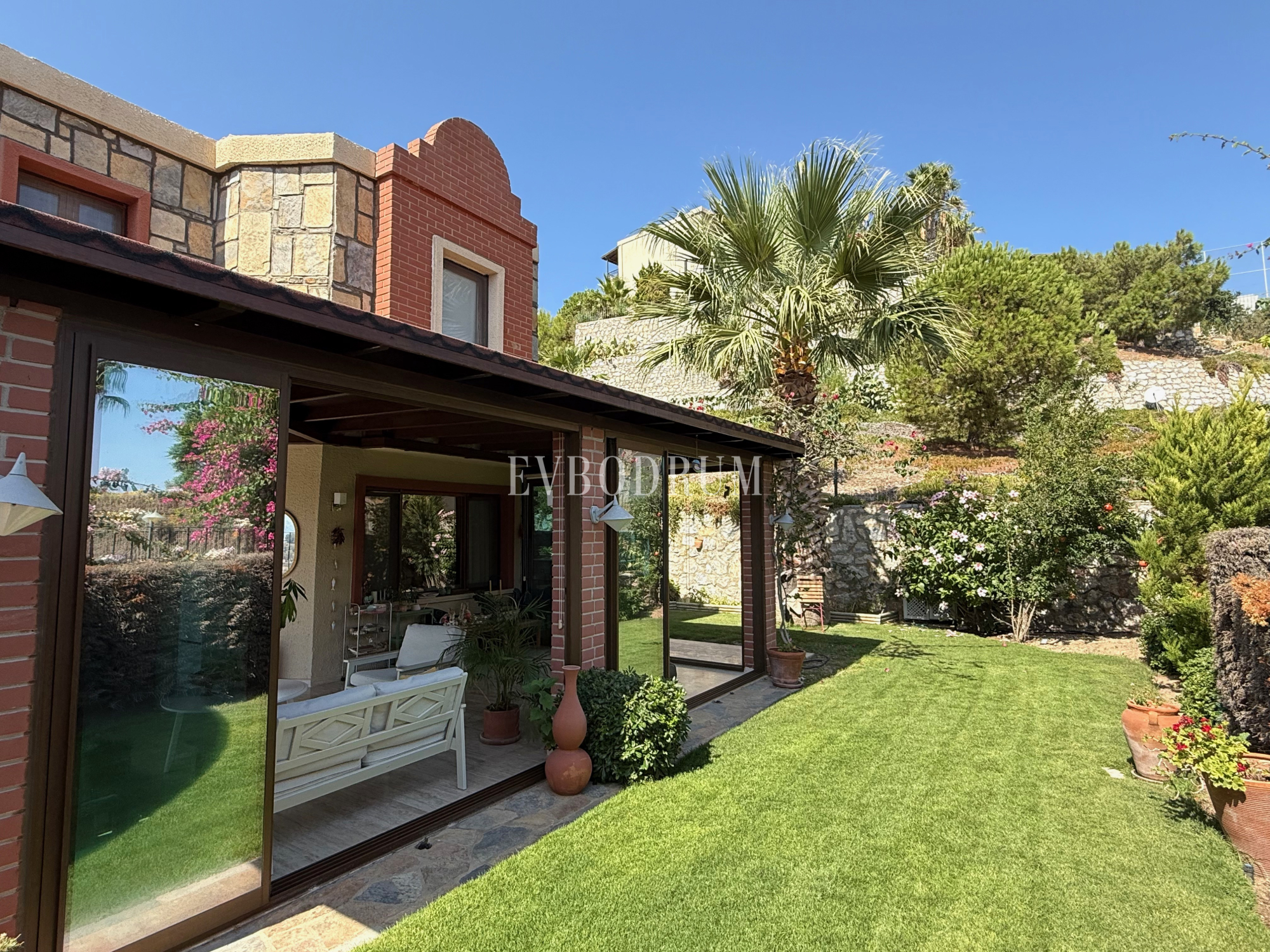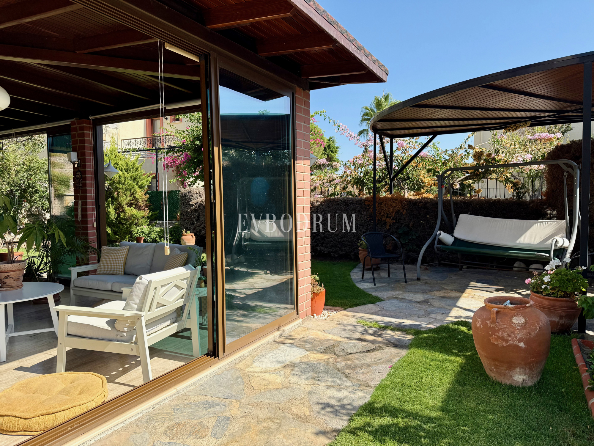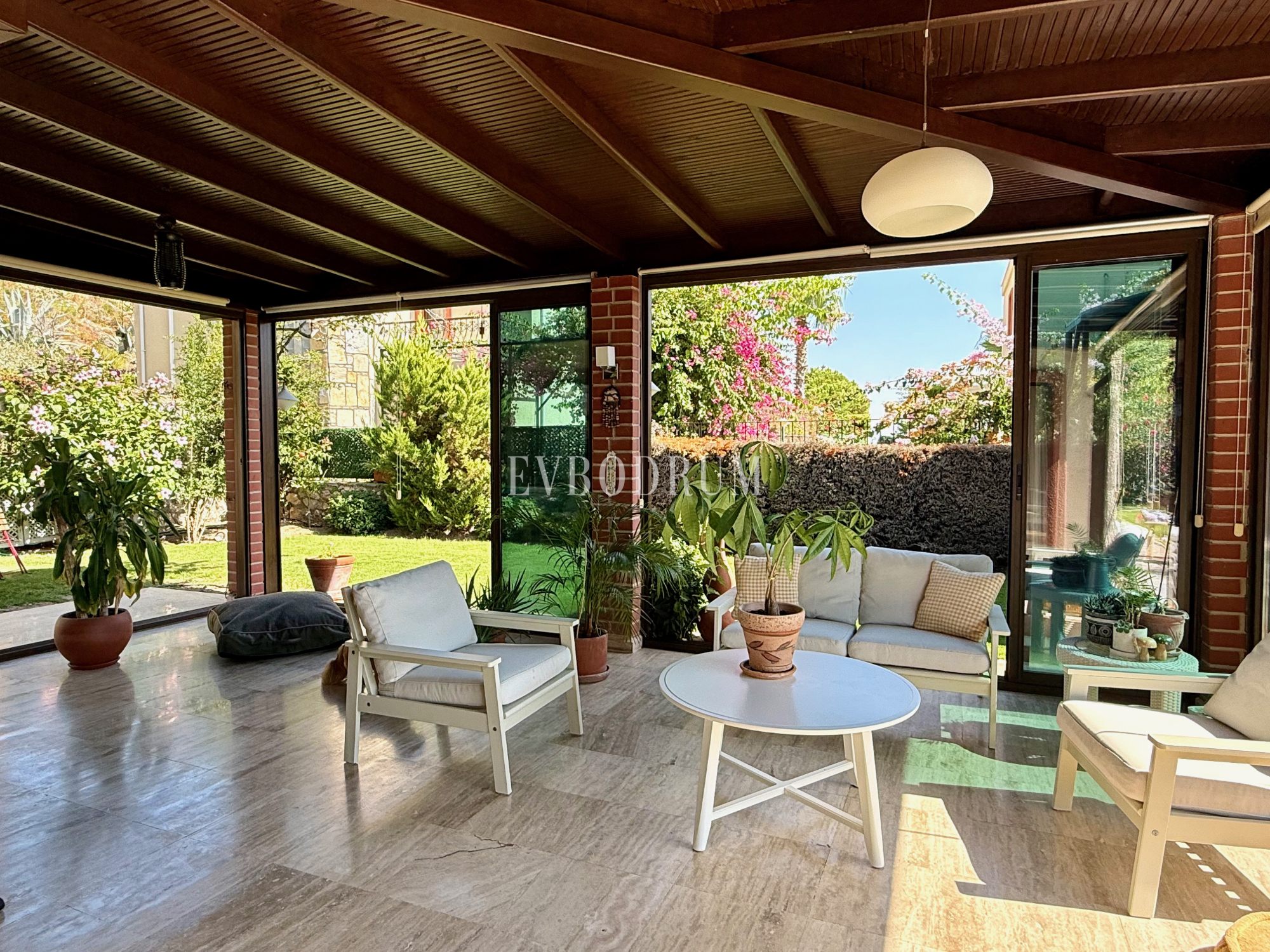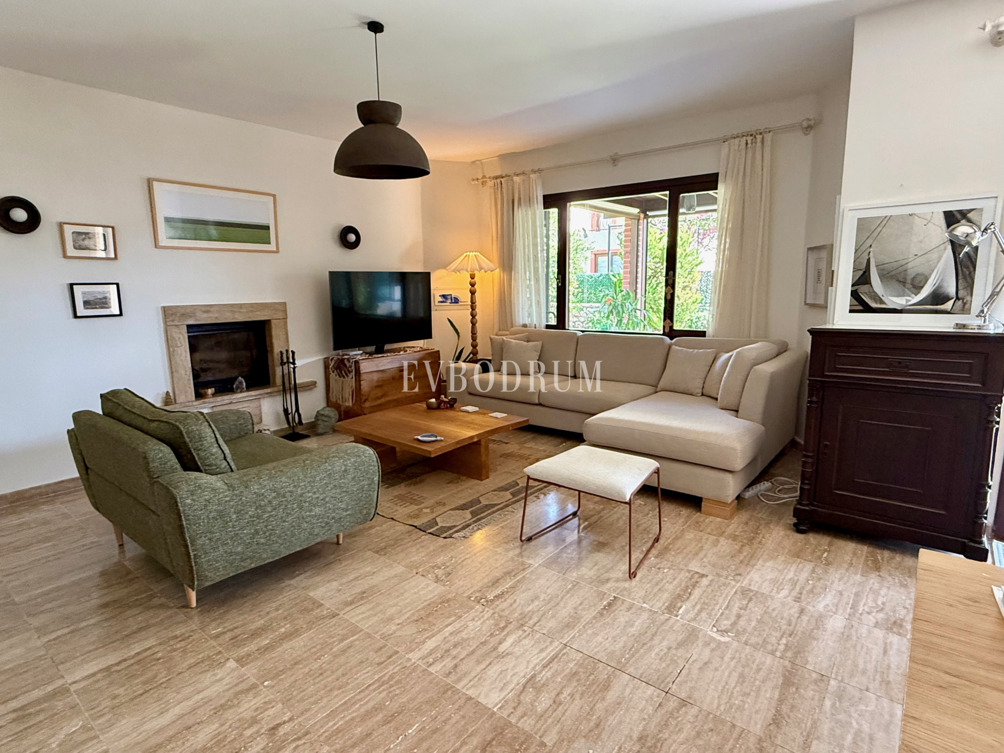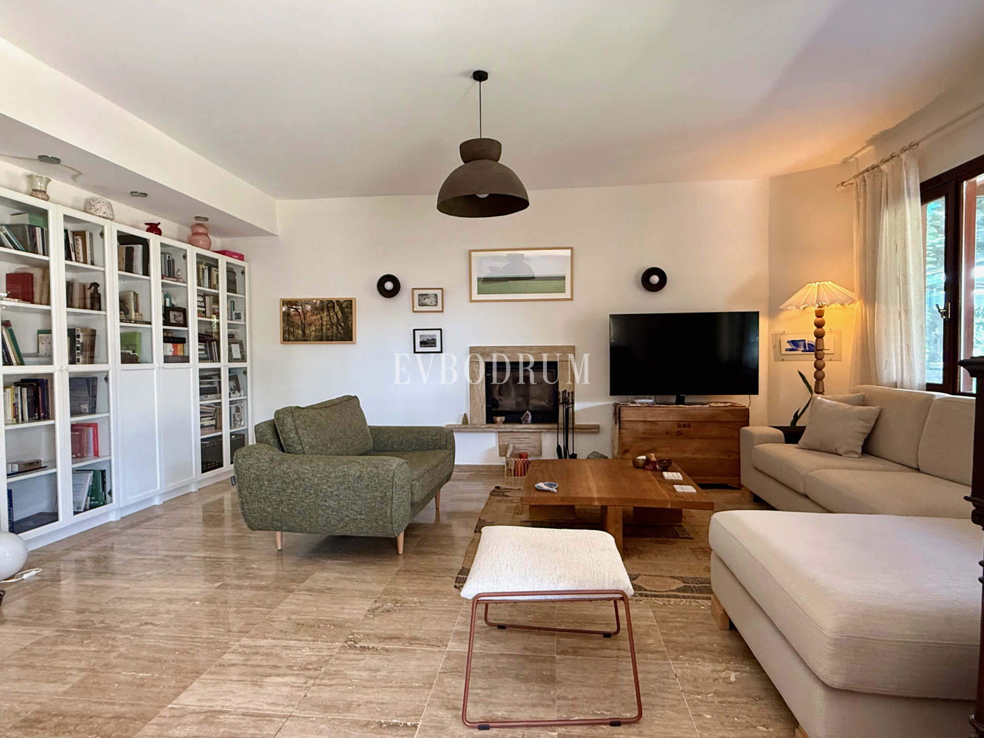 Gündoğan’ın köklü sitelerinden olan Çamlı Konakları’nda yer alan bu özel villa, geniş bahçesi, terası ve kesintisiz doğa manzarasıyla hem yaz hem kış konfor sunuyor. Evin hemen önünde bulunan güneşlikli özel otoparktan, bahçeye giriliyor. Çimlerle çevrili bahçenin tam ortasında konumlanan villaya girildiğinde, sağda banyolu bir misafir odası, karşıda ise kullanışlı açık mutfak ve kiler karşılıyor. Mutfağın yanındaki yemek alanı ve şömineli geniş salon, evin kalbini oluşturan ve dört mevsim keyifle kullanılan kış bahçesine açılıyor. Bu katta ayrıca bir misafir tuvaleti de bulunuyor.