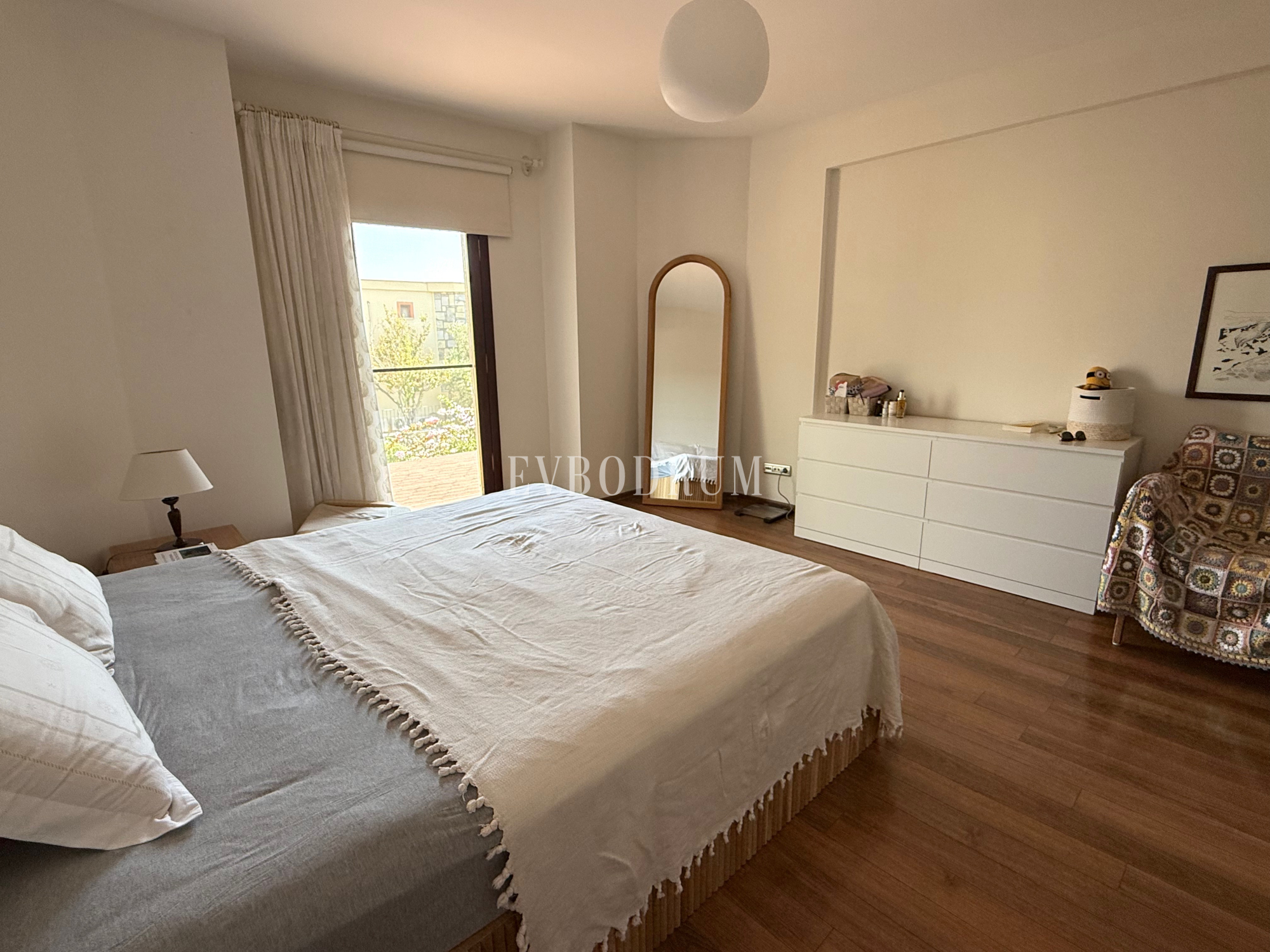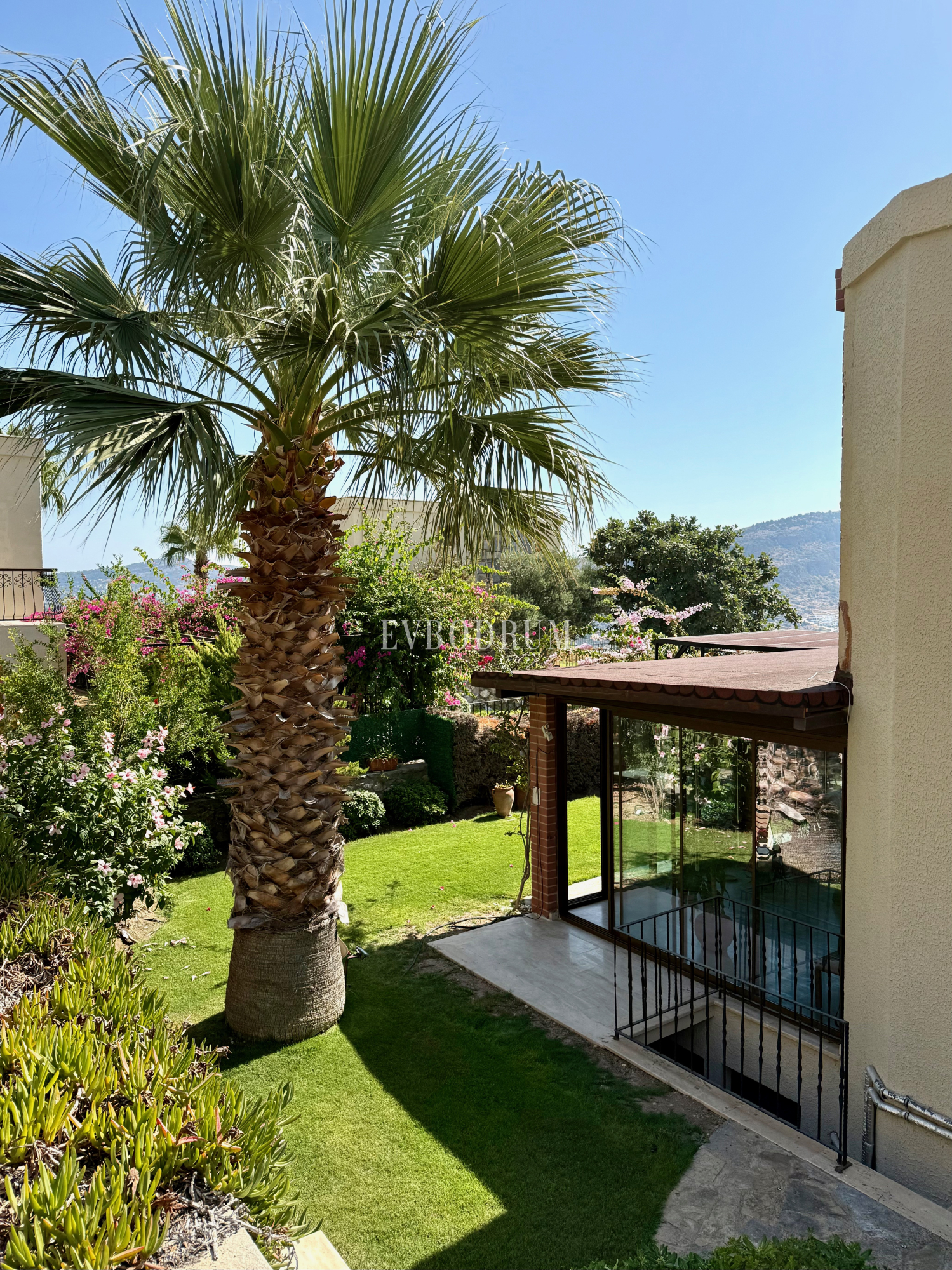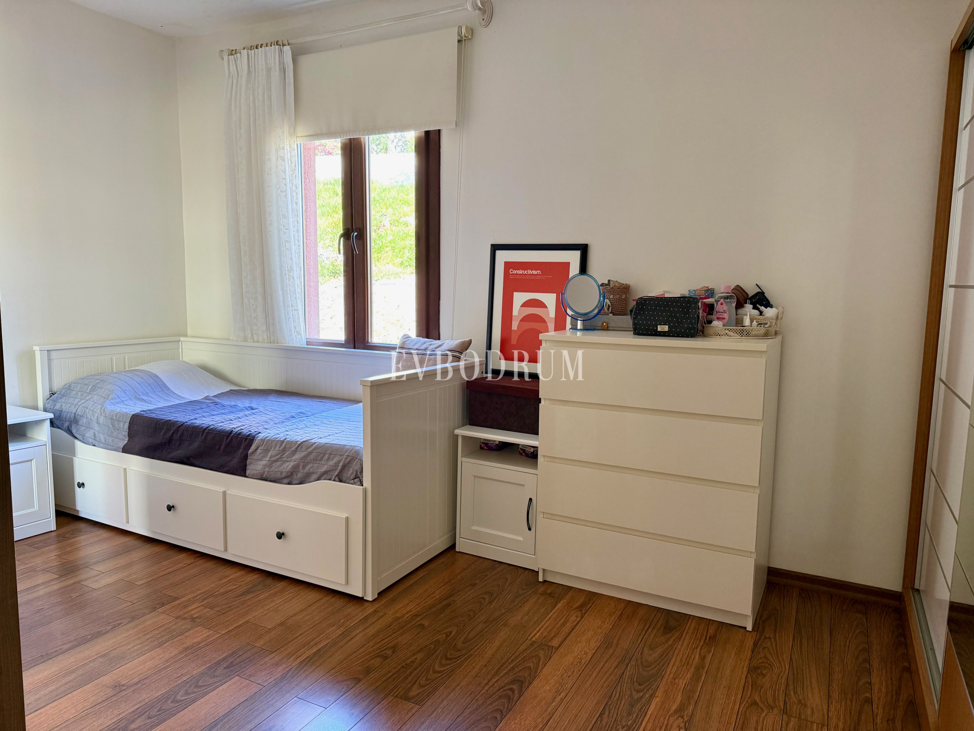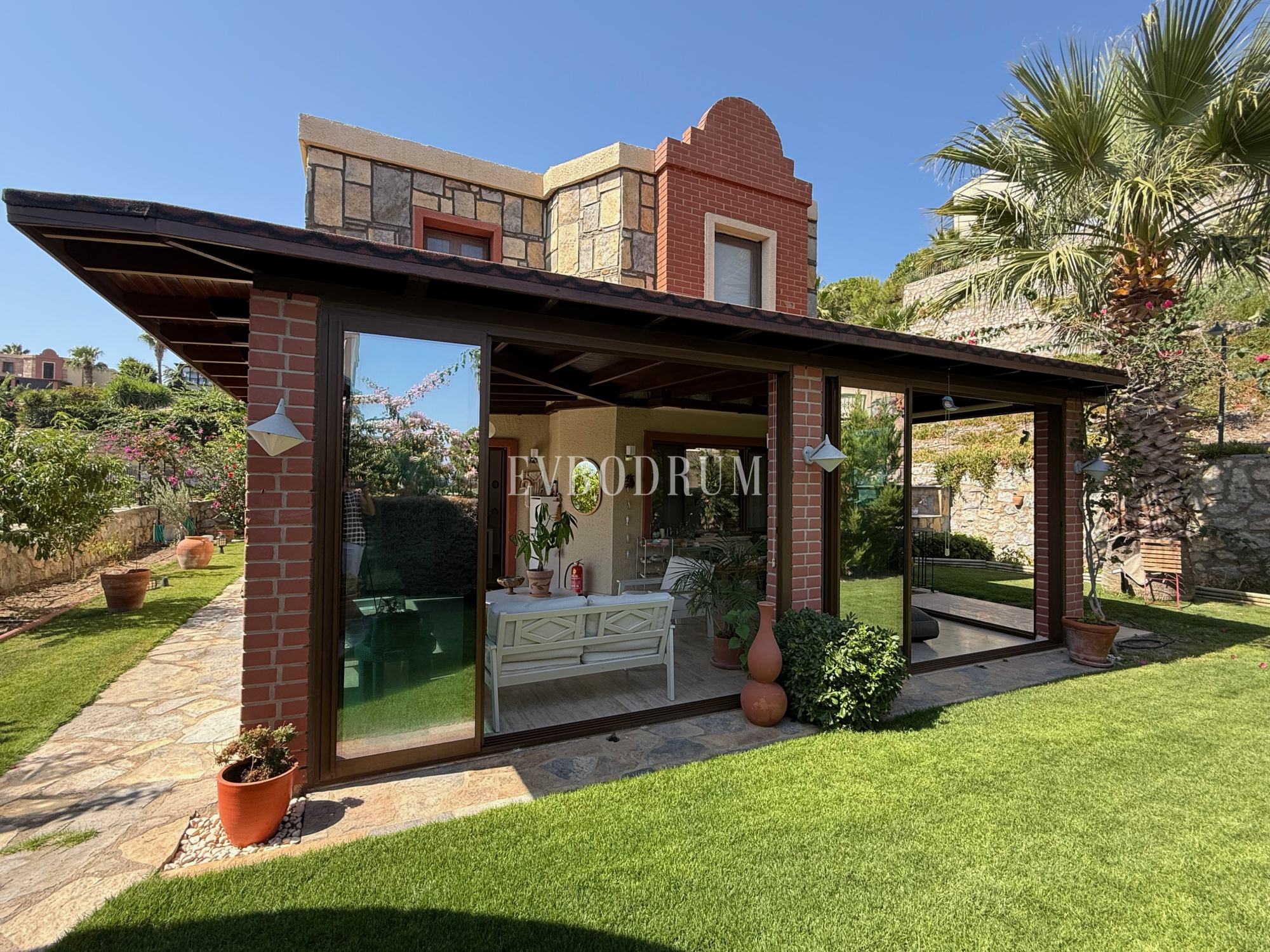 Gündoğan’ın köklü sitelerinden olan Çamlı Konakları’nda yer alan bu özel villa, geniş bahçesi, terası ve kesintisiz doğa manzarasıyla hem yaz hem kış konfor sunuyor. Evin hemen önünde bulunan güneşlikli özel otoparktan, bahçeye giriliyor. Çimlerle çevrili bahçenin tam ortasında konumlanan villaya girildiğinde, sağda banyolu bir misafir odası, karşıda ise kullanışlı açık mutfak ve kiler karşılıyor. Mutfağın yanındaki yemek alanı ve şömineli geniş salon, evin kalbini oluşturan ve dört mevsim keyifle kullanılan kış bahçesine açılıyor. Bu katta ayrıca bir misafir tuvaleti de bulunuyor.