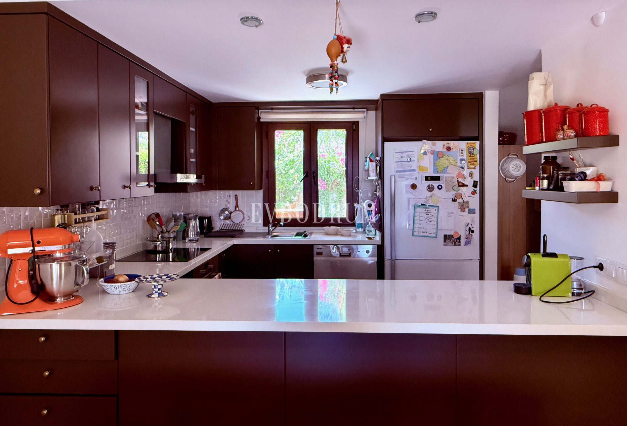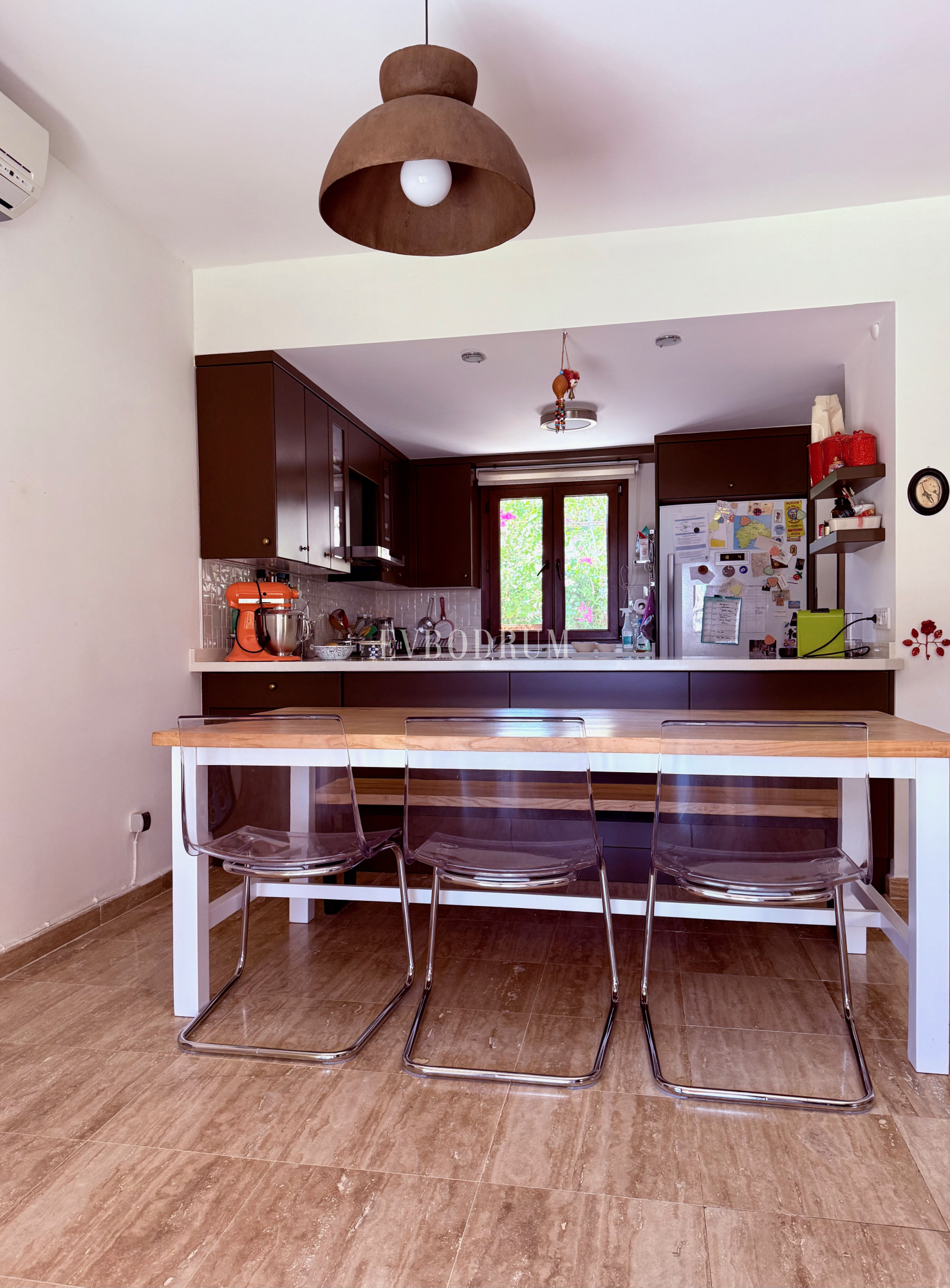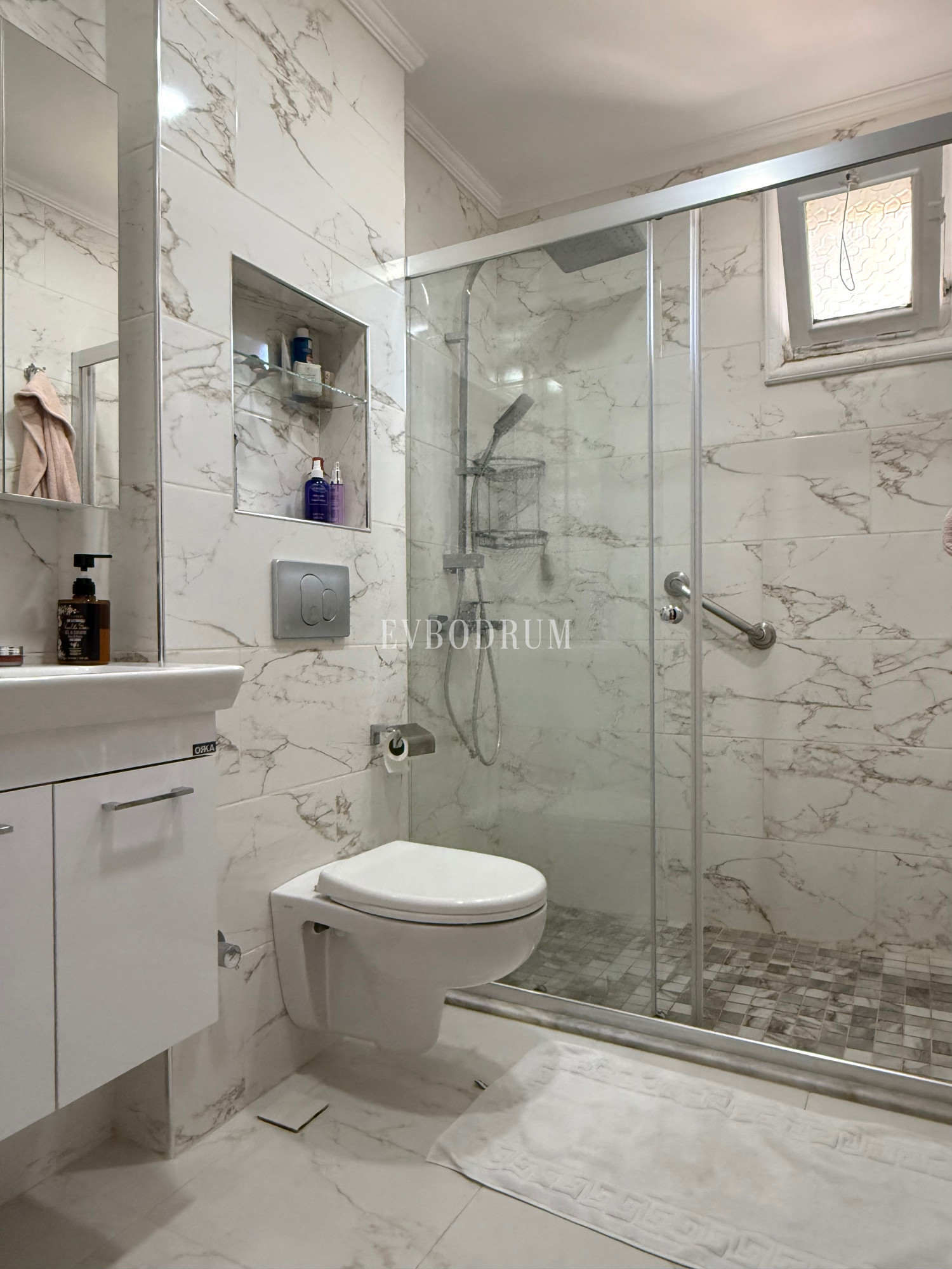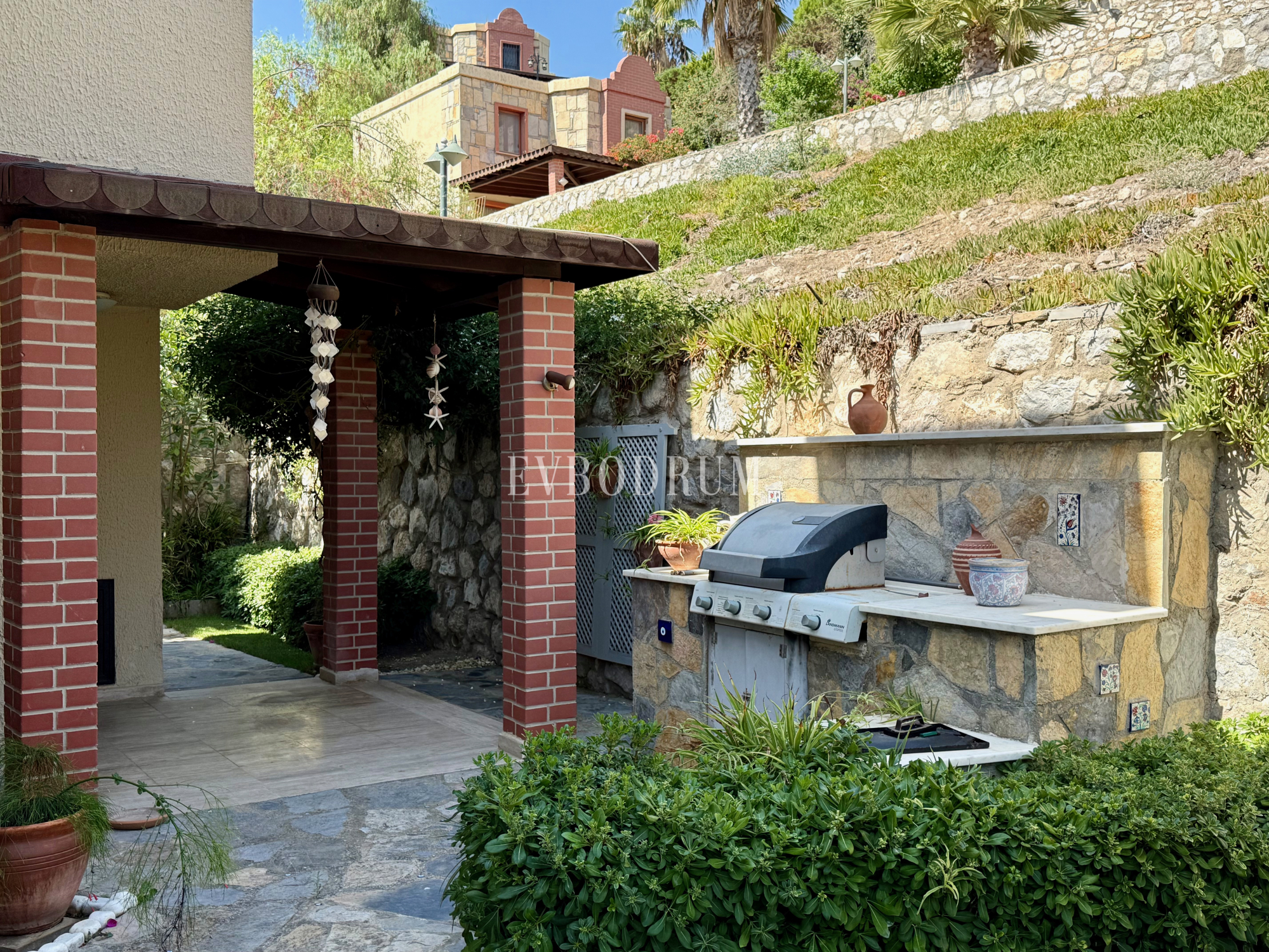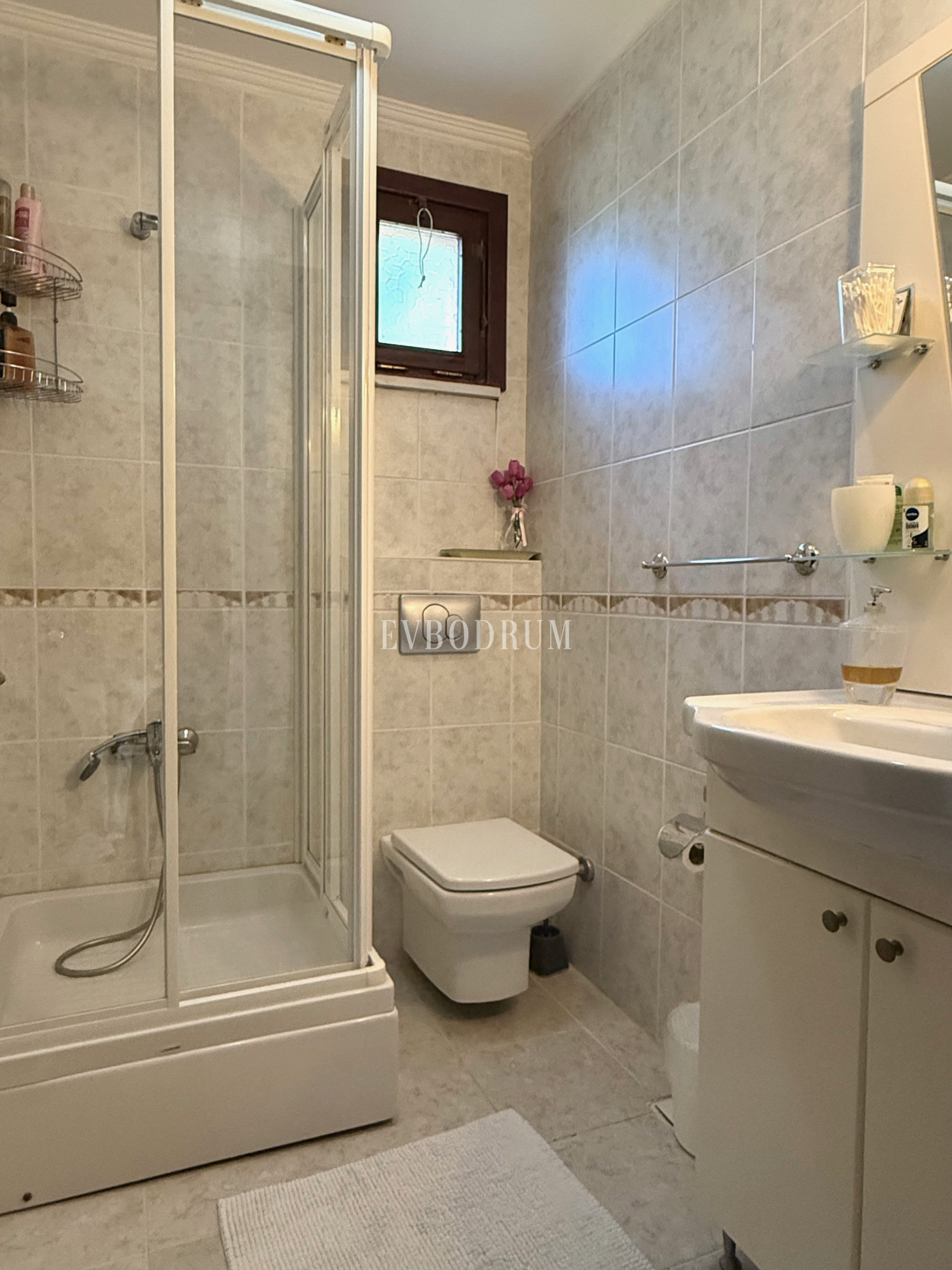 Gündoğan’ın köklü sitelerinden olan Çamlı Konakları’nda yer alan bu özel villa, geniş bahçesi, terası ve kesintisiz doğa manzarasıyla hem yaz hem kış konfor sunuyor. Evin hemen önünde bulunan güneşlikli özel otoparktan, bahçeye giriliyor. Çimlerle çevrili bahçenin tam ortasında konumlanan villaya girildiğinde, sağda banyolu bir misafir odası, karşıda ise kullanışlı açık mutfak ve kiler karşılıyor. Mutfağın yanındaki yemek alanı ve şömineli geniş salon, evin kalbini oluşturan ve dört mevsim keyifle kullanılan kış bahçesine açılıyor. Bu katta ayrıca bir misafir tuvaleti de bulunuyor.