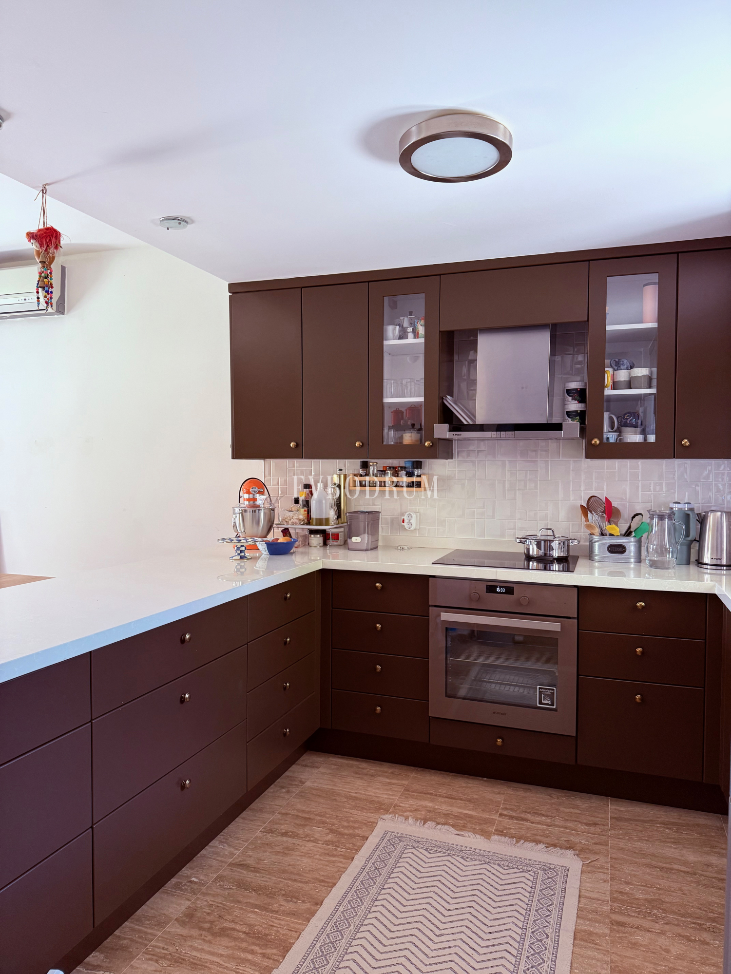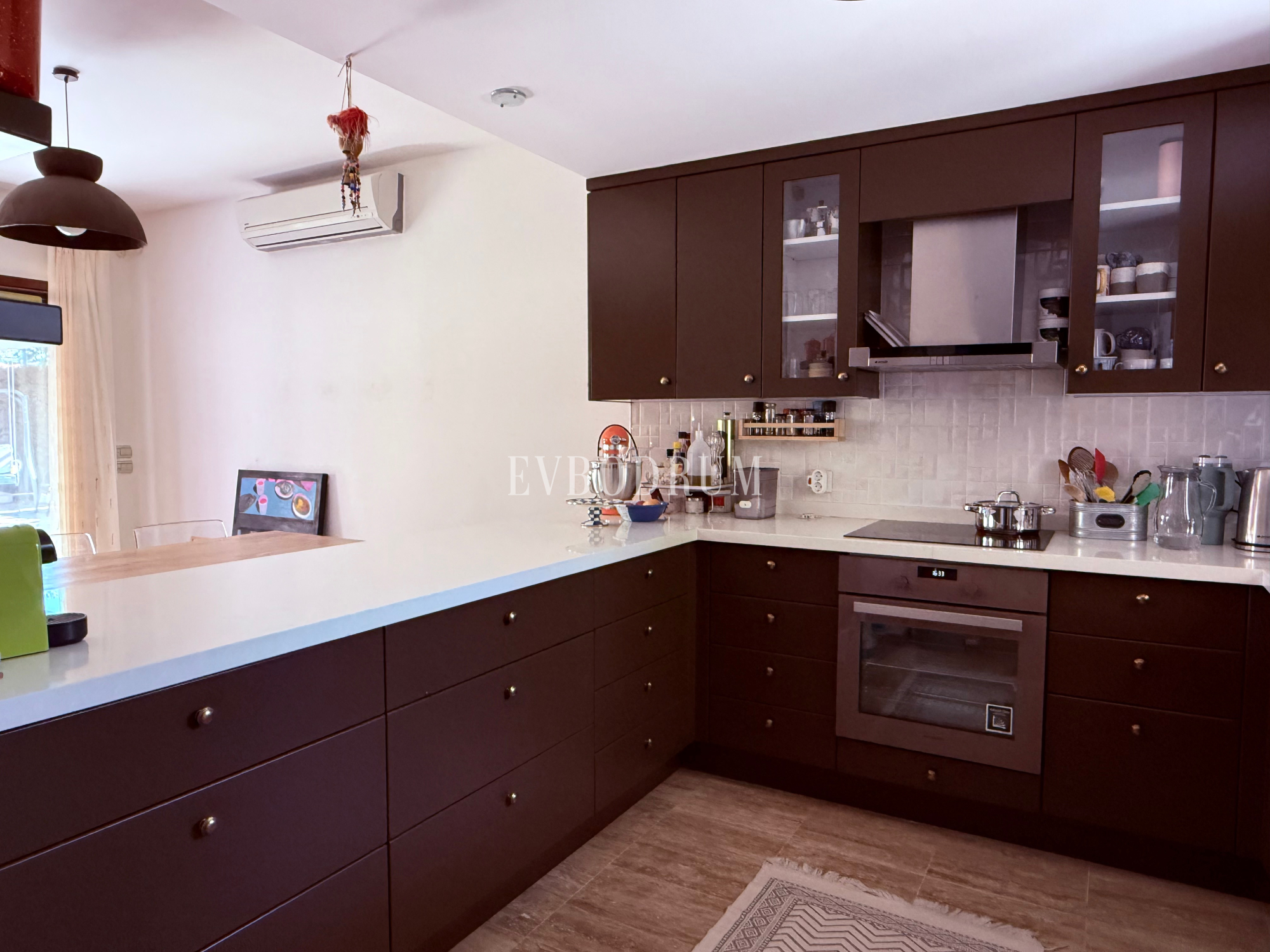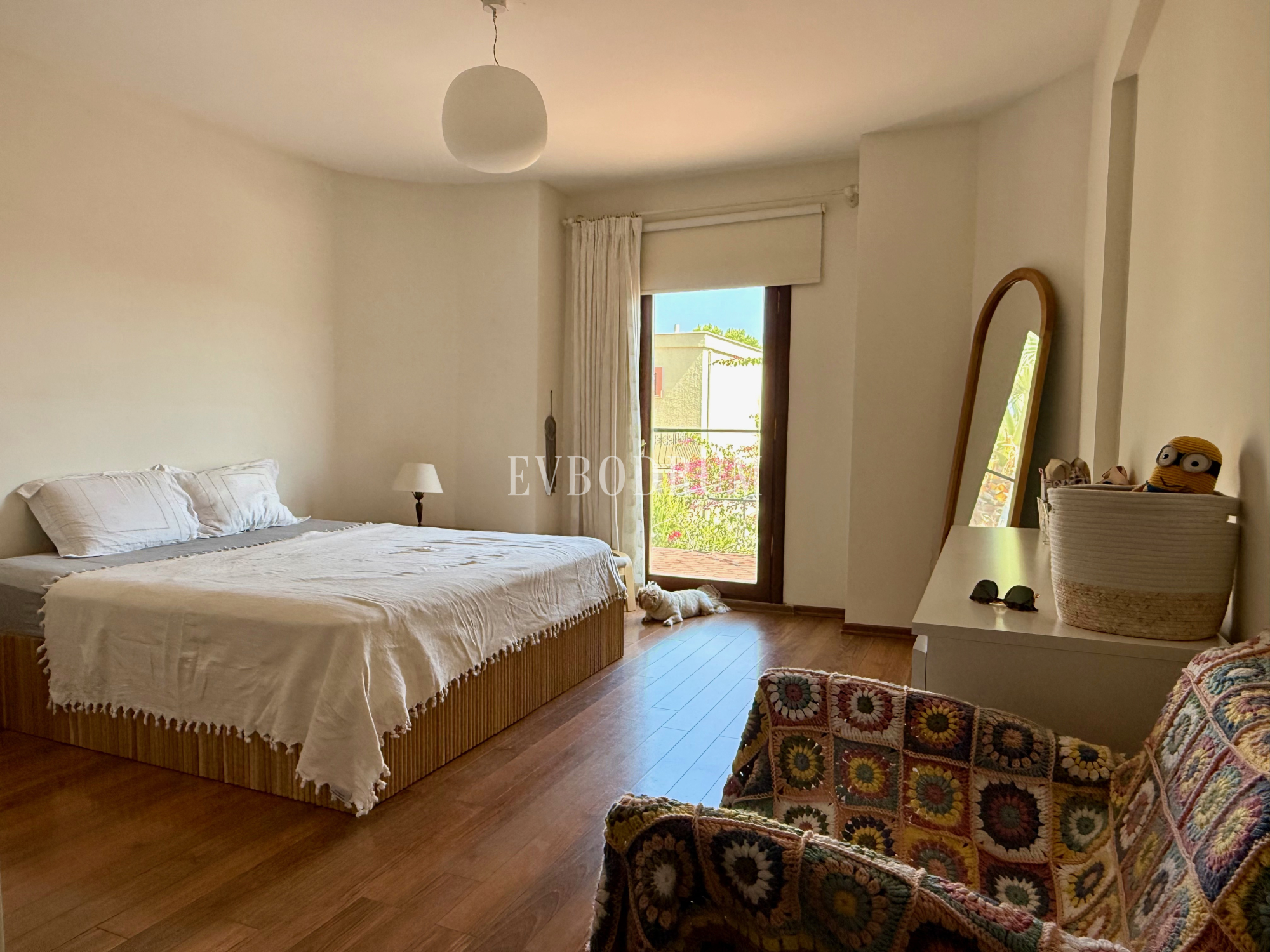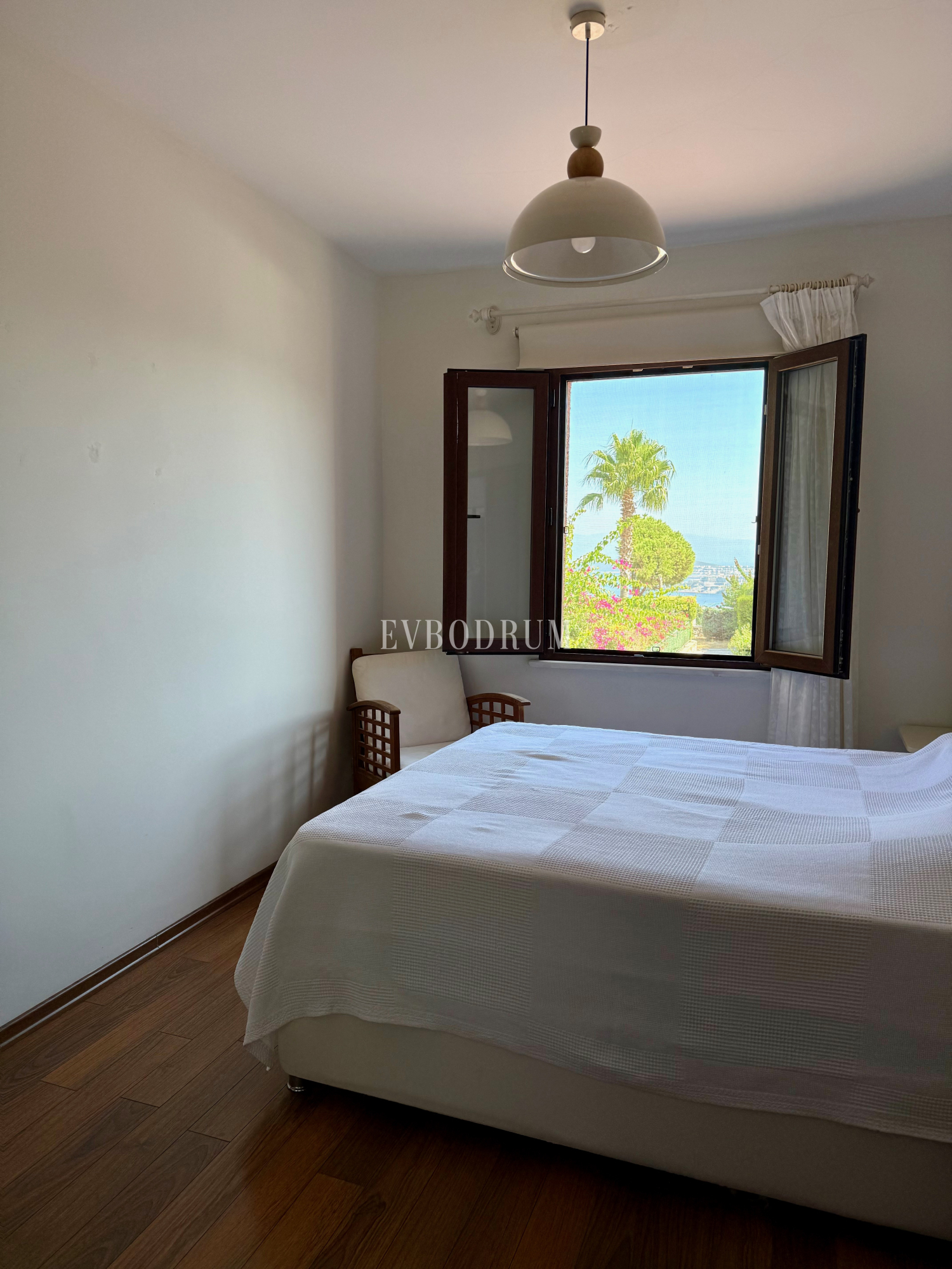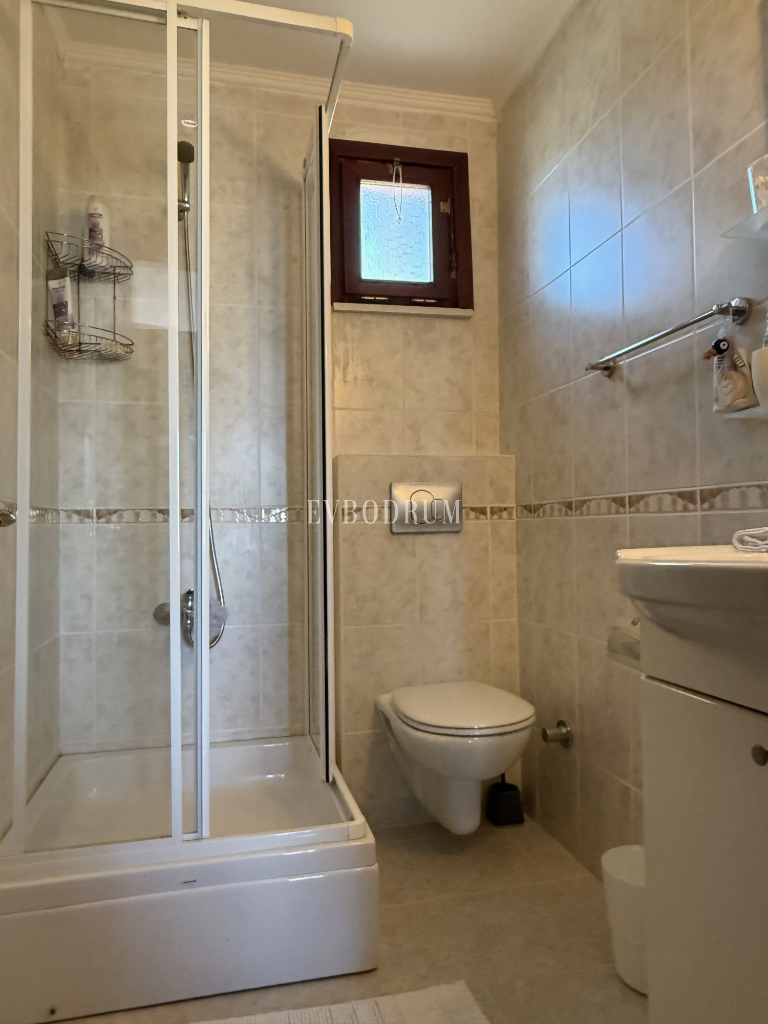 Gündoğan’ın köklü sitelerinden olan Çamlı Konakları’nda yer alan bu özel villa, geniş bahçesi, terası ve kesintisiz doğa manzarasıyla hem yaz hem kış konfor sunuyor. Evin hemen önünde bulunan güneşlikli özel otoparktan, bahçeye giriliyor. Çimlerle çevrili bahçenin tam ortasında konumlanan villaya girildiğinde, sağda banyolu bir misafir odası, karşıda ise kullanışlı açık mutfak ve kiler karşılıyor. Mutfağın yanındaki yemek alanı ve şömineli geniş salon, evin kalbini oluşturan ve dört mevsim keyifle kullanılan kış bahçesine açılıyor. Bu katta ayrıca bir misafir tuvaleti de bulunuyor.