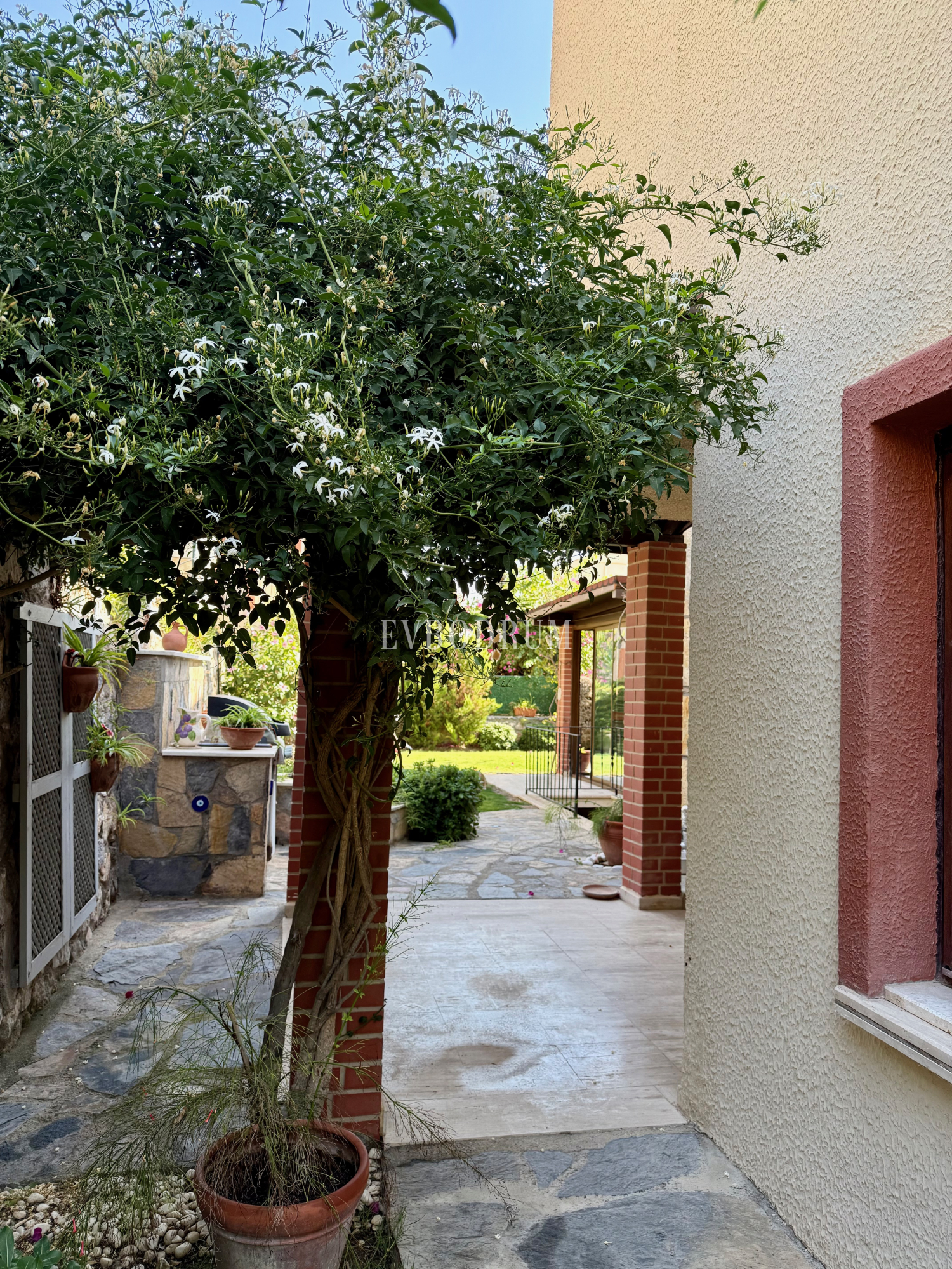 Villanın odak noktası, kış bahçesinin etrafını saran çimlik alan ve yetişmiş meyve ağaçları.