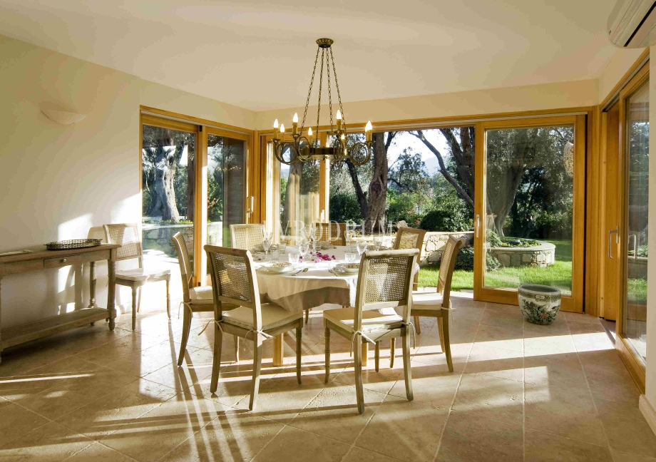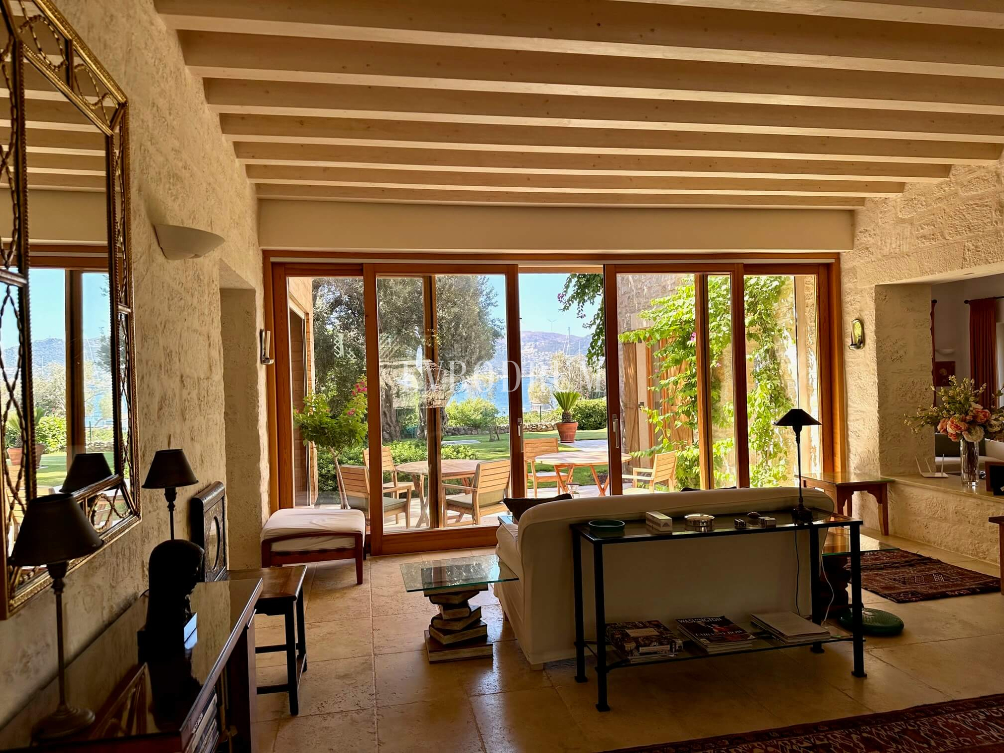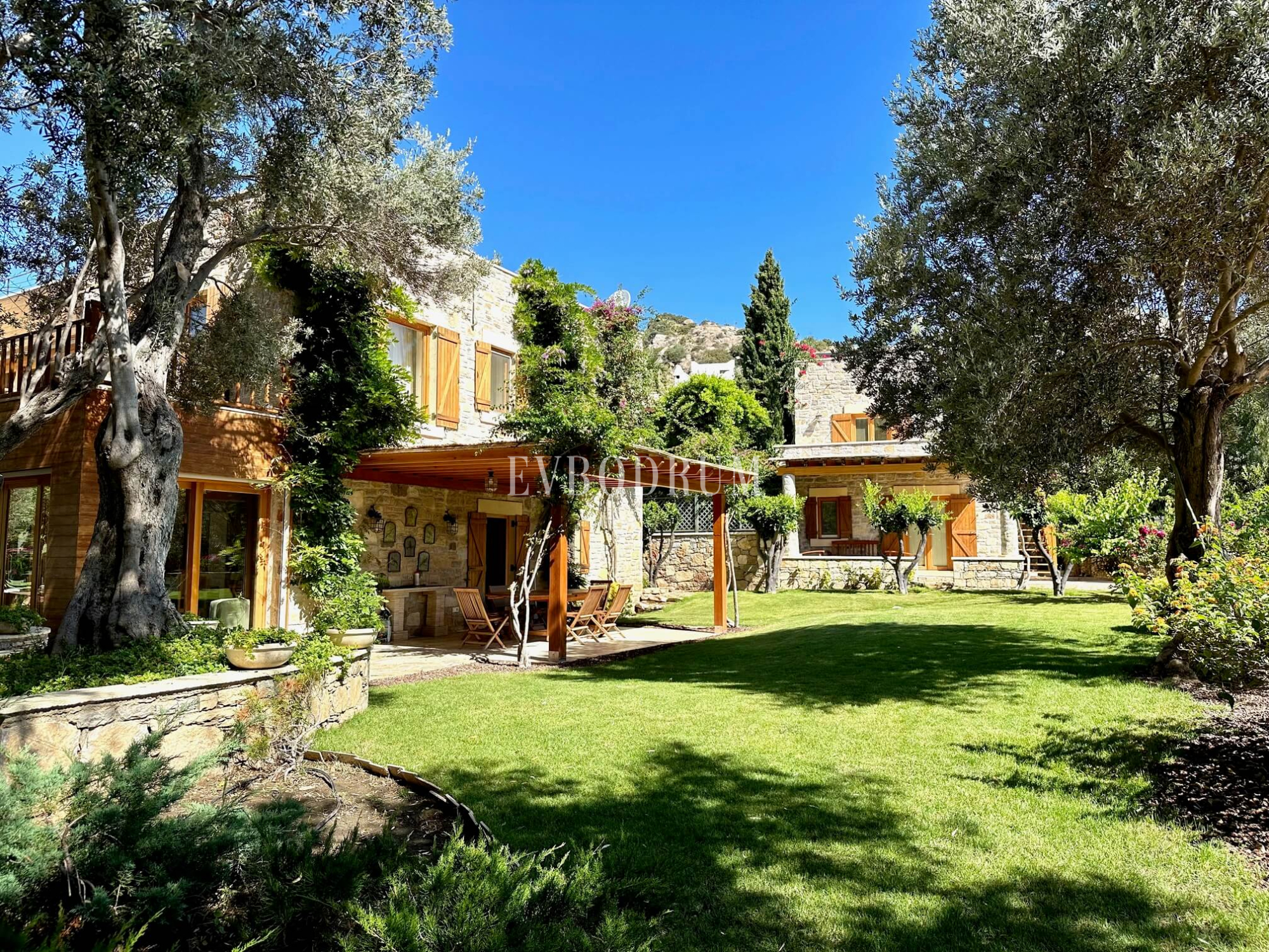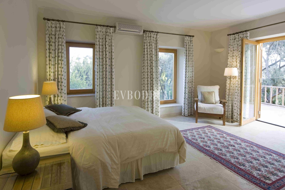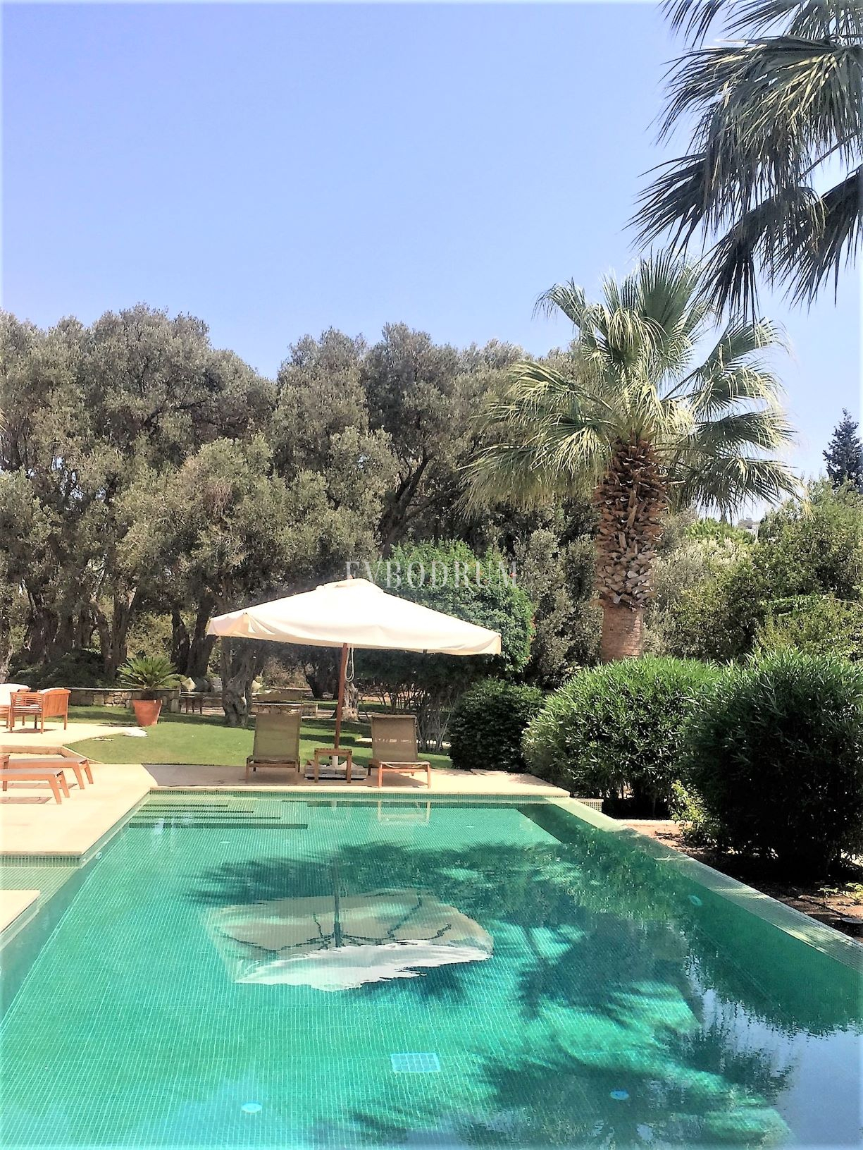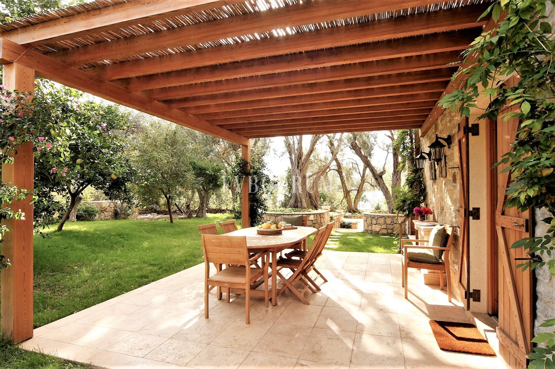 Geniş bahçe taş duvarlarla korunmaktadır, mahremiyeti yetişkin palmiye ve zeytin ağaçlarıyla garanti altına alınmıştır.