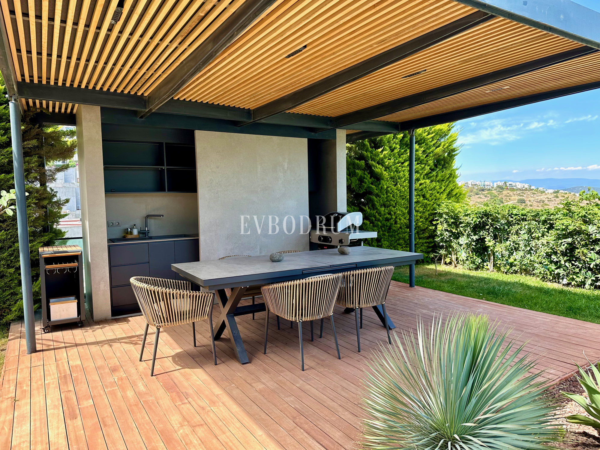 Açık mutfak kış için kapatılabilir, tam donanımlıdır ve gölgeli açık yemek alanı konukları ağırlamak için idealdir.