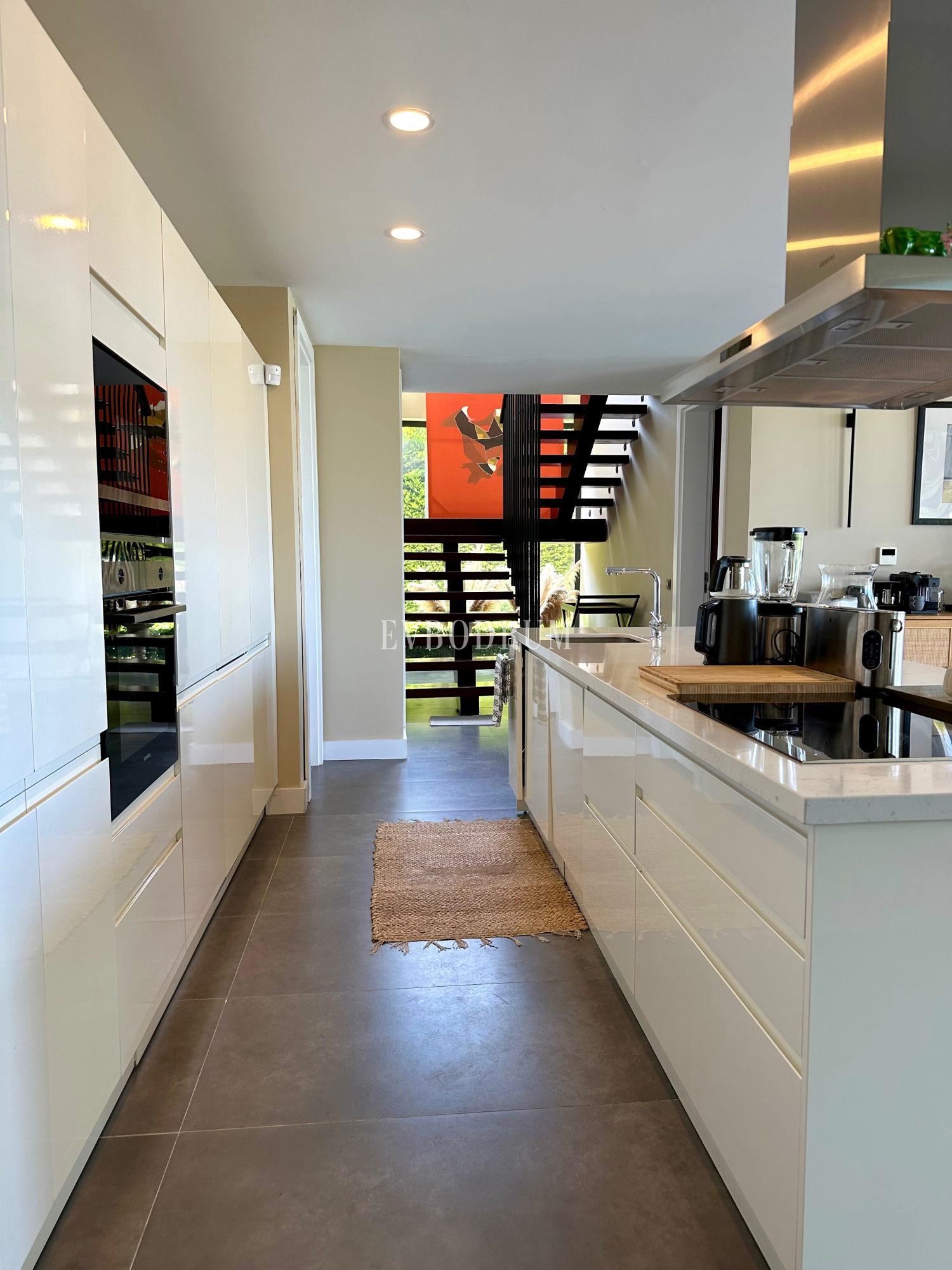 Salonun yanında gölgeli terasa ve havuz alanına açılan açık plan, tam donanımlı mutfak vardır. Malzeme odası ve banyosu olan hoş bir personel odası ise mutfağın arkasındadır.