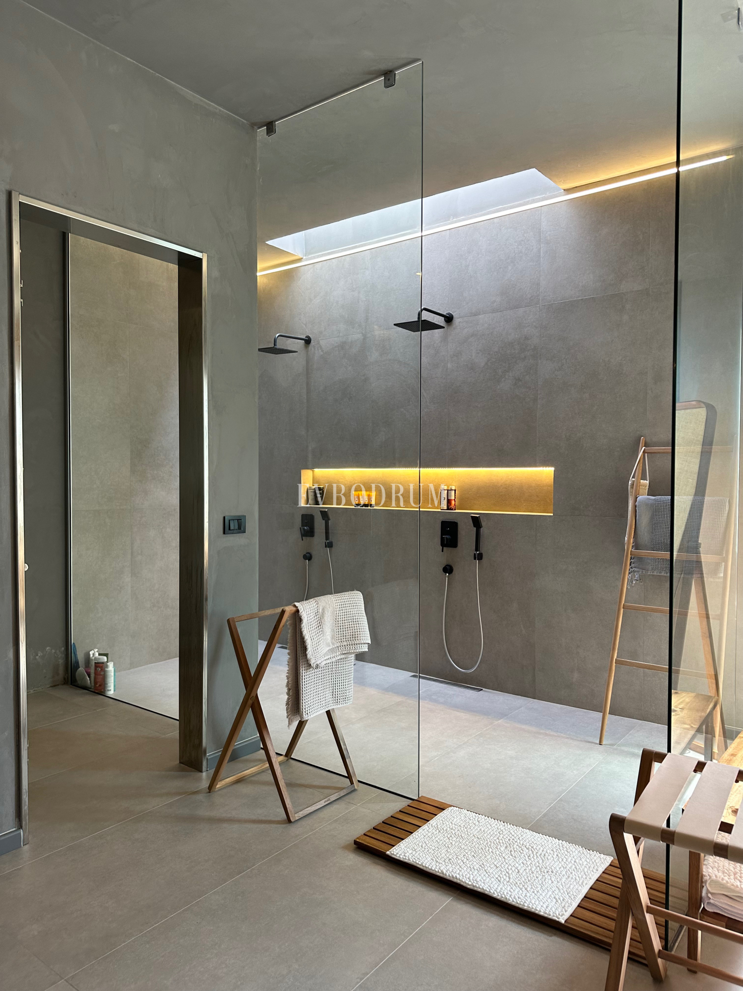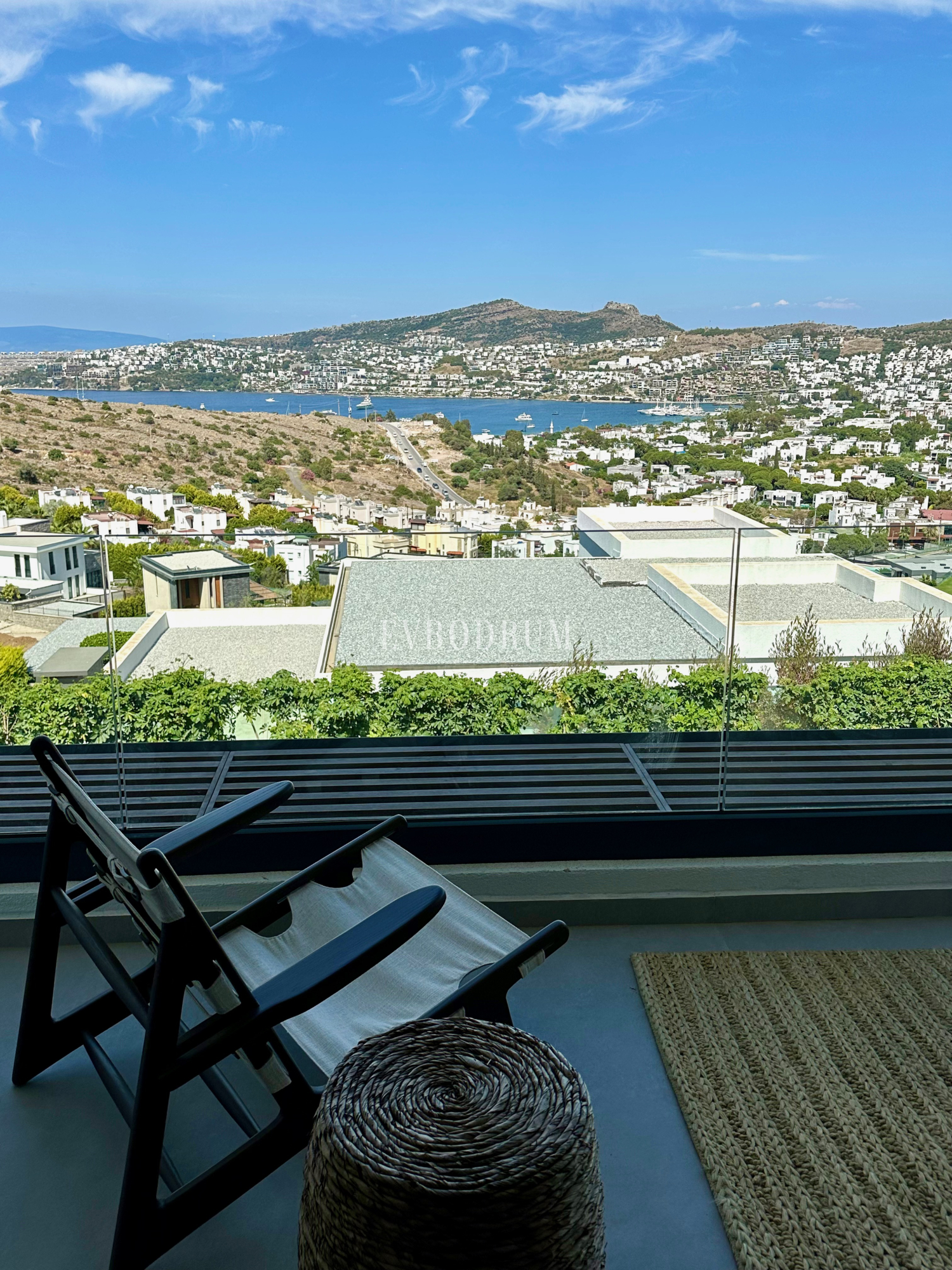 Gündoğan Körfezi'nin manzarasını kucaklayan yüksek tavanlara ve yere kadar uzanan pencerelere sahip salon yer alır.