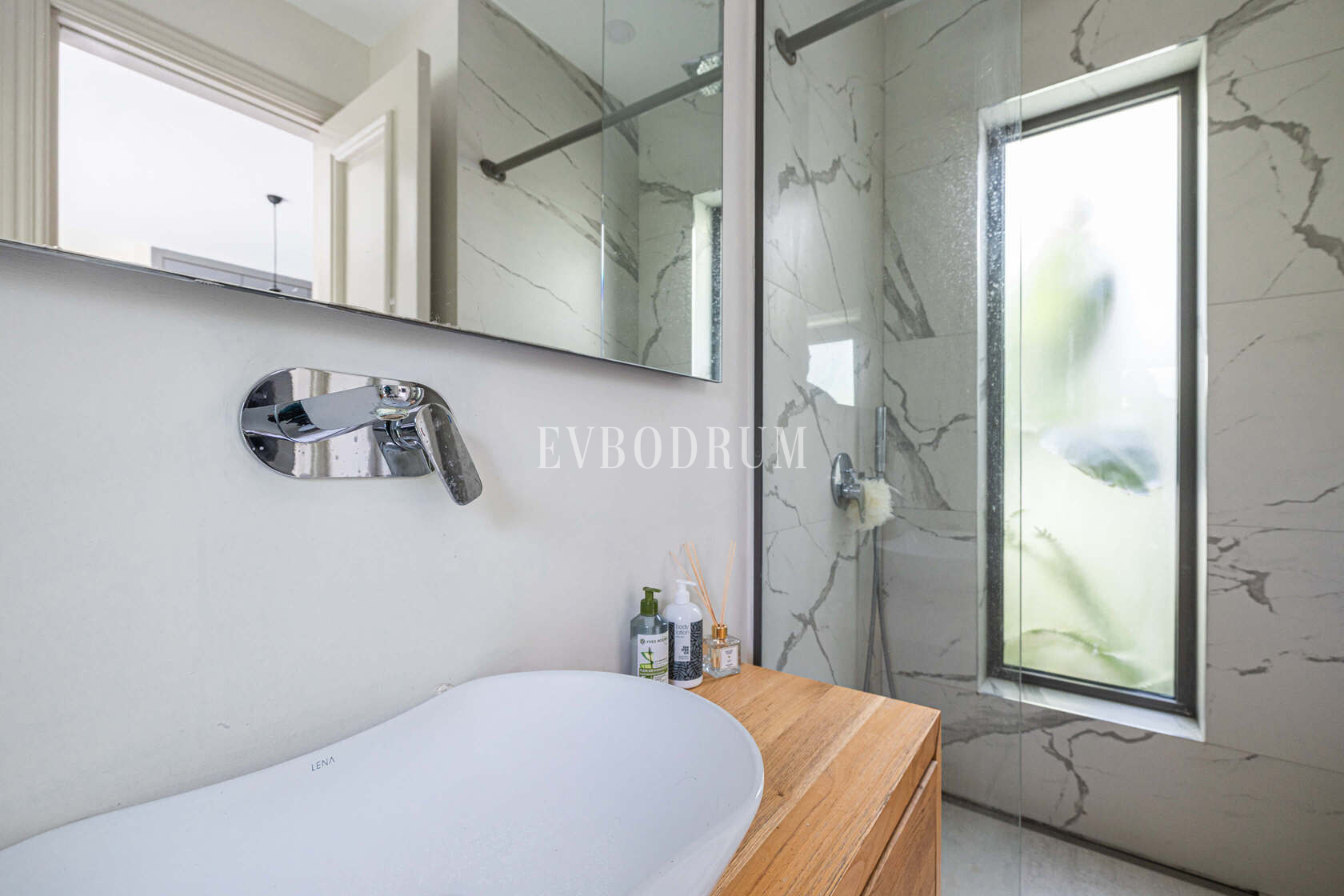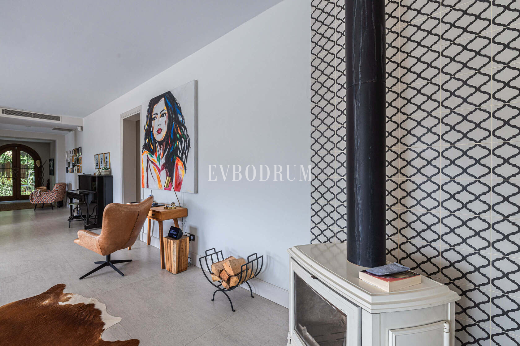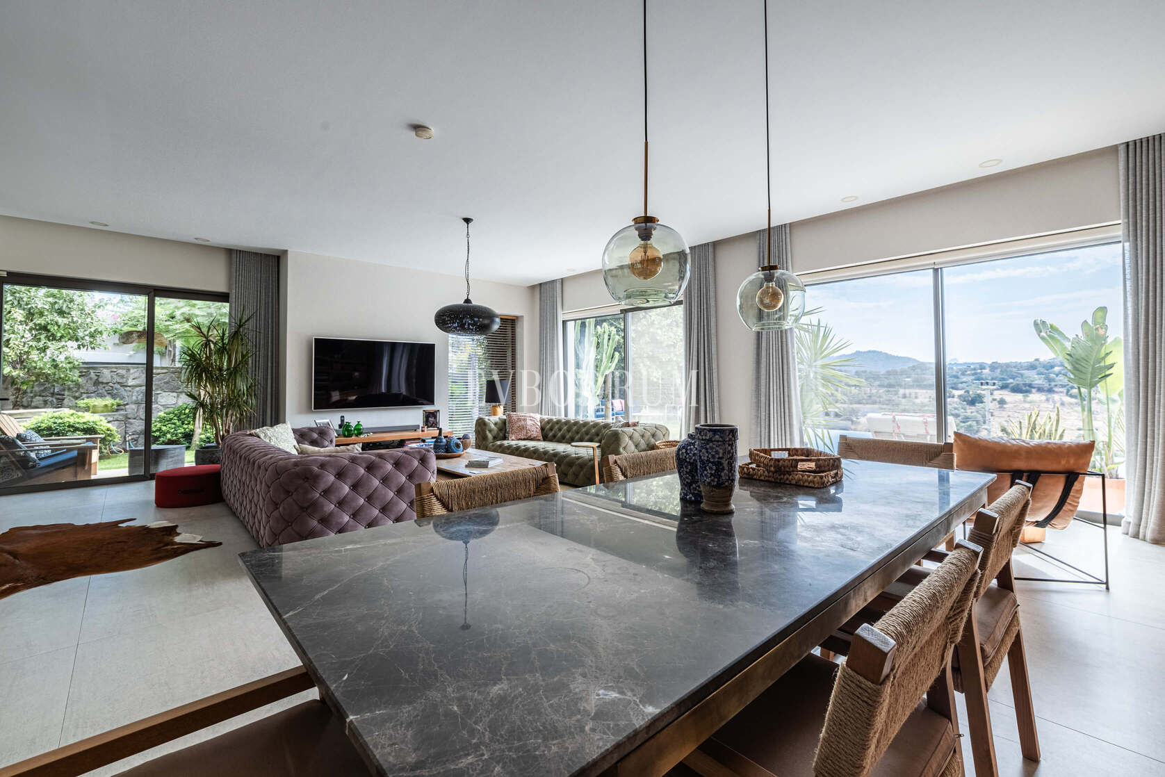 Görkemli giriş kapısı, geniş salona ve oradan da geniş yemek alanına sahip ferah yaşam alanına açılmaktadır. Tavandan tabana uzanan sürgülü cam kapılar kesintisiz manzaraya doğru açılır ve evin etrafını çevreleyen teraslara, bahçeye ve havuza doğrudan erişim sağlar.