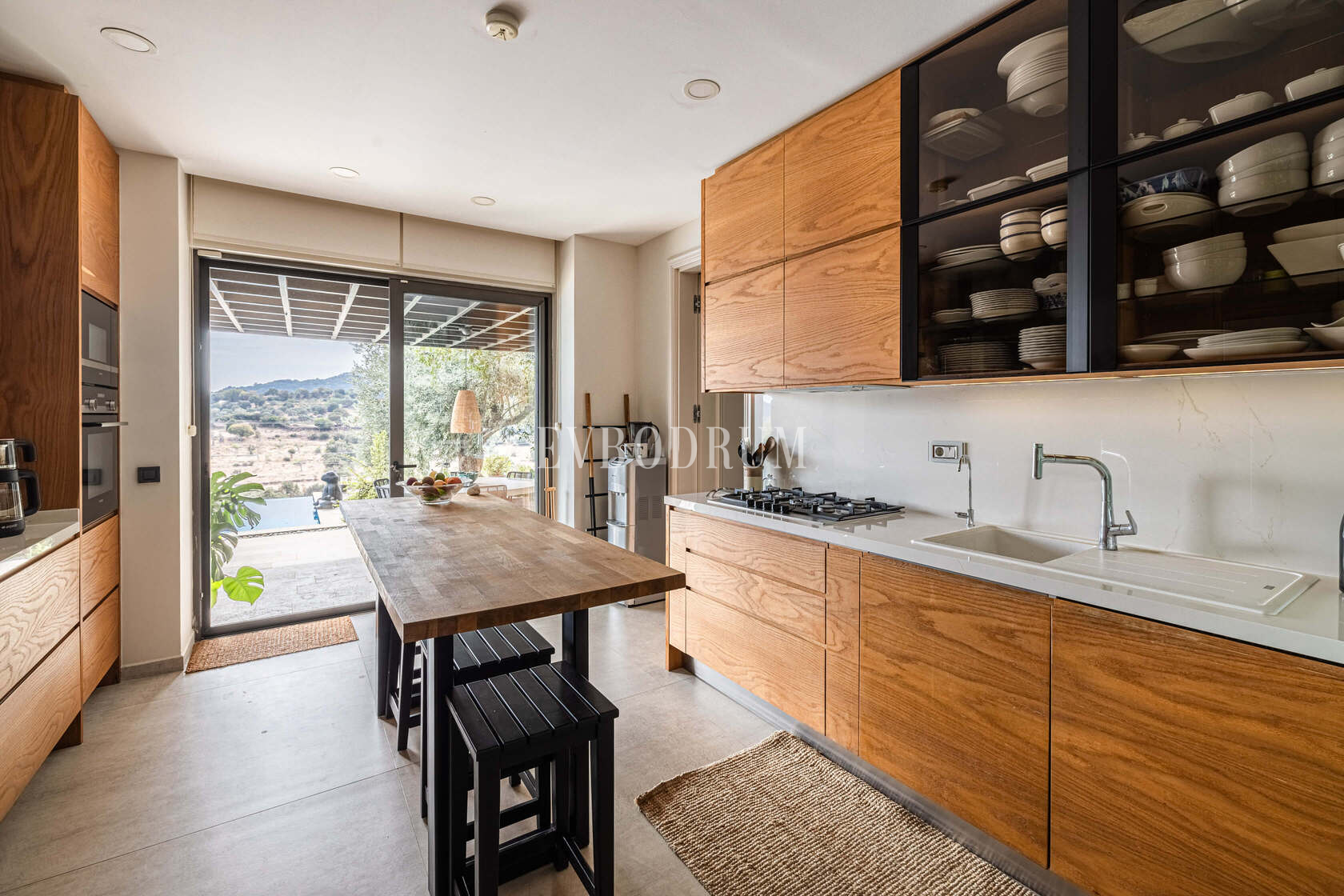 Mükemmel donanımlı modern mutfaktan gölgeli yemek terasına doğrudan erişim vardır.