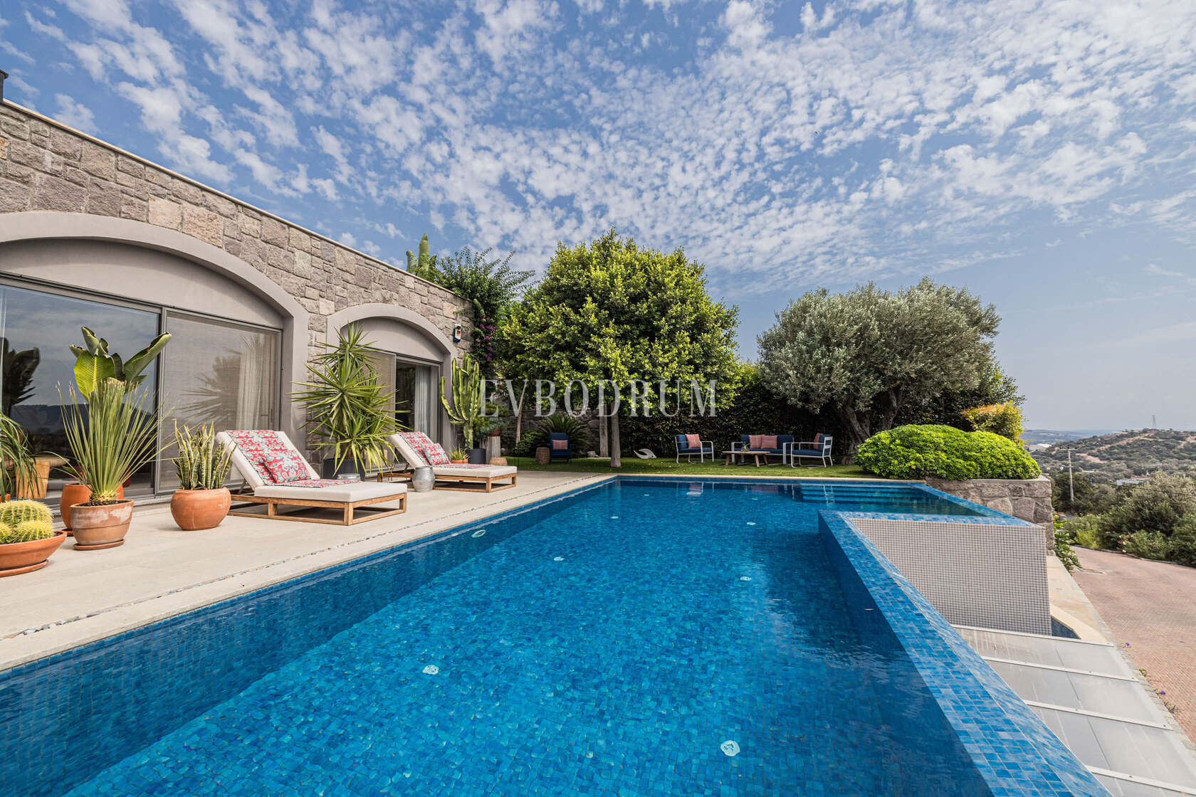 Gün ışığını cömertçe alan, yüksek tavanlı ev, profesyonelce peyzajlanmış bahçe, birden fazla gölgeli oturma alanları, büyük havuz ile güzel bir şekilde düzenlenmiş modern ve dengeli bir auraya sahiptir.