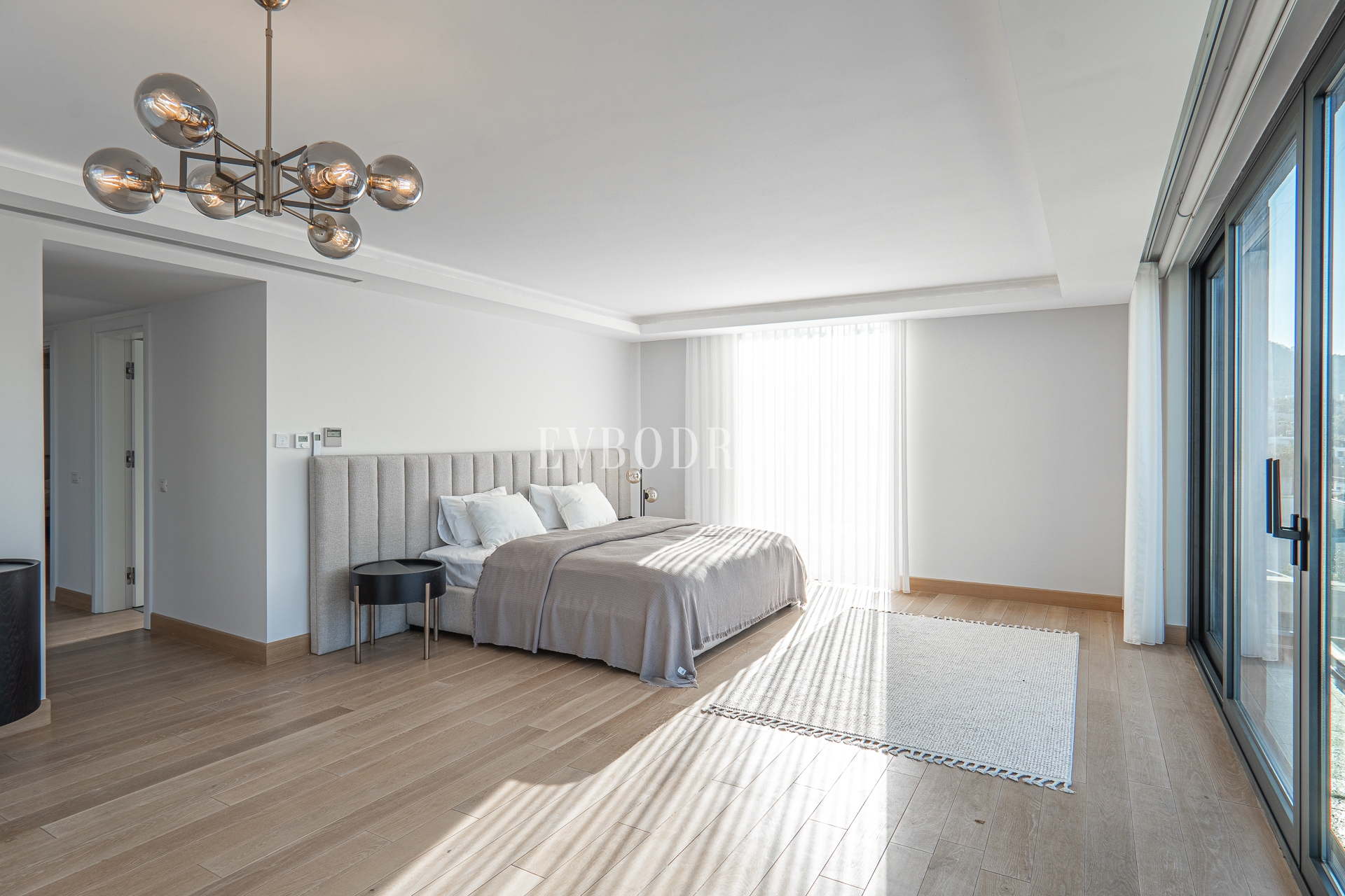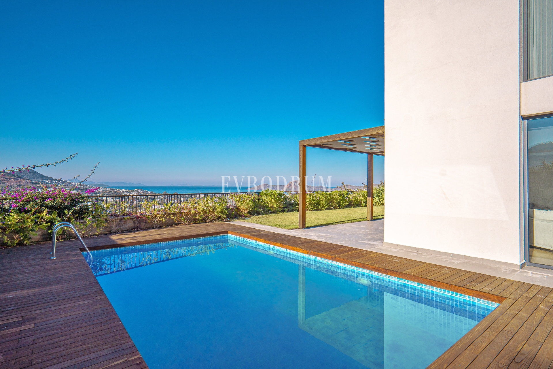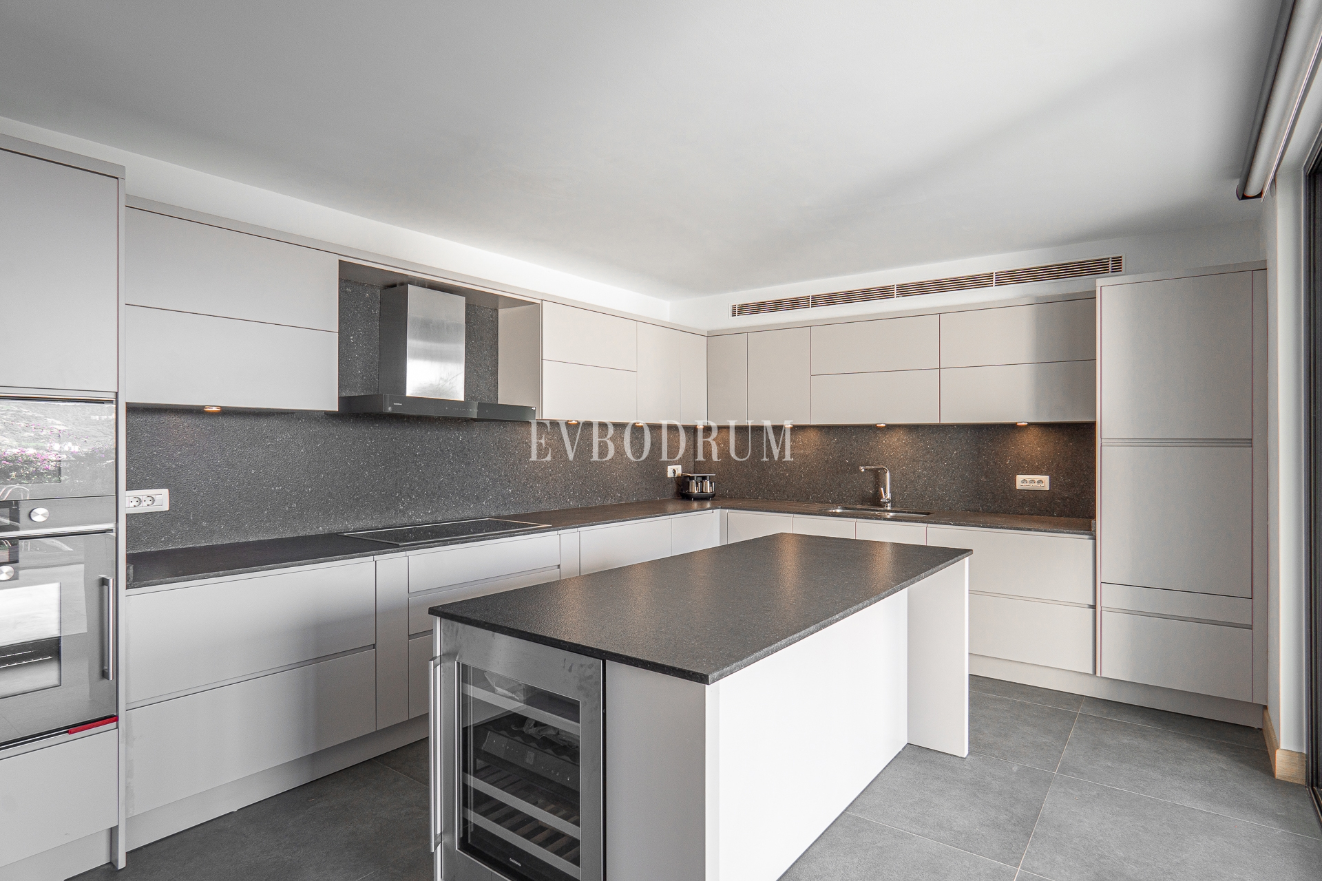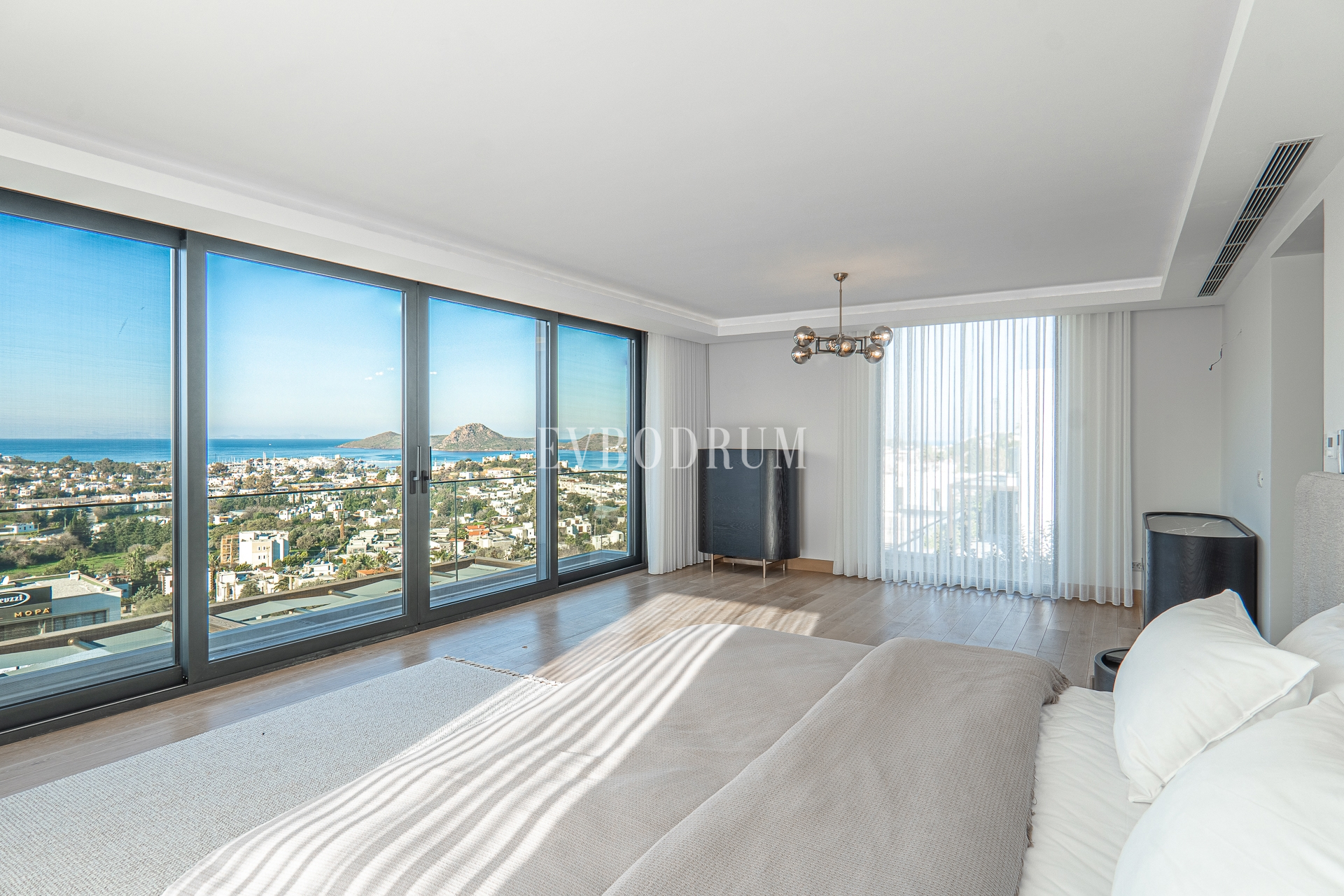 Kapalı ve geniş garajdan direkt girilen oldukça geniş salon, Yalıkavak Marina, koy ve harika gün batımı manzarasına bakıyor.