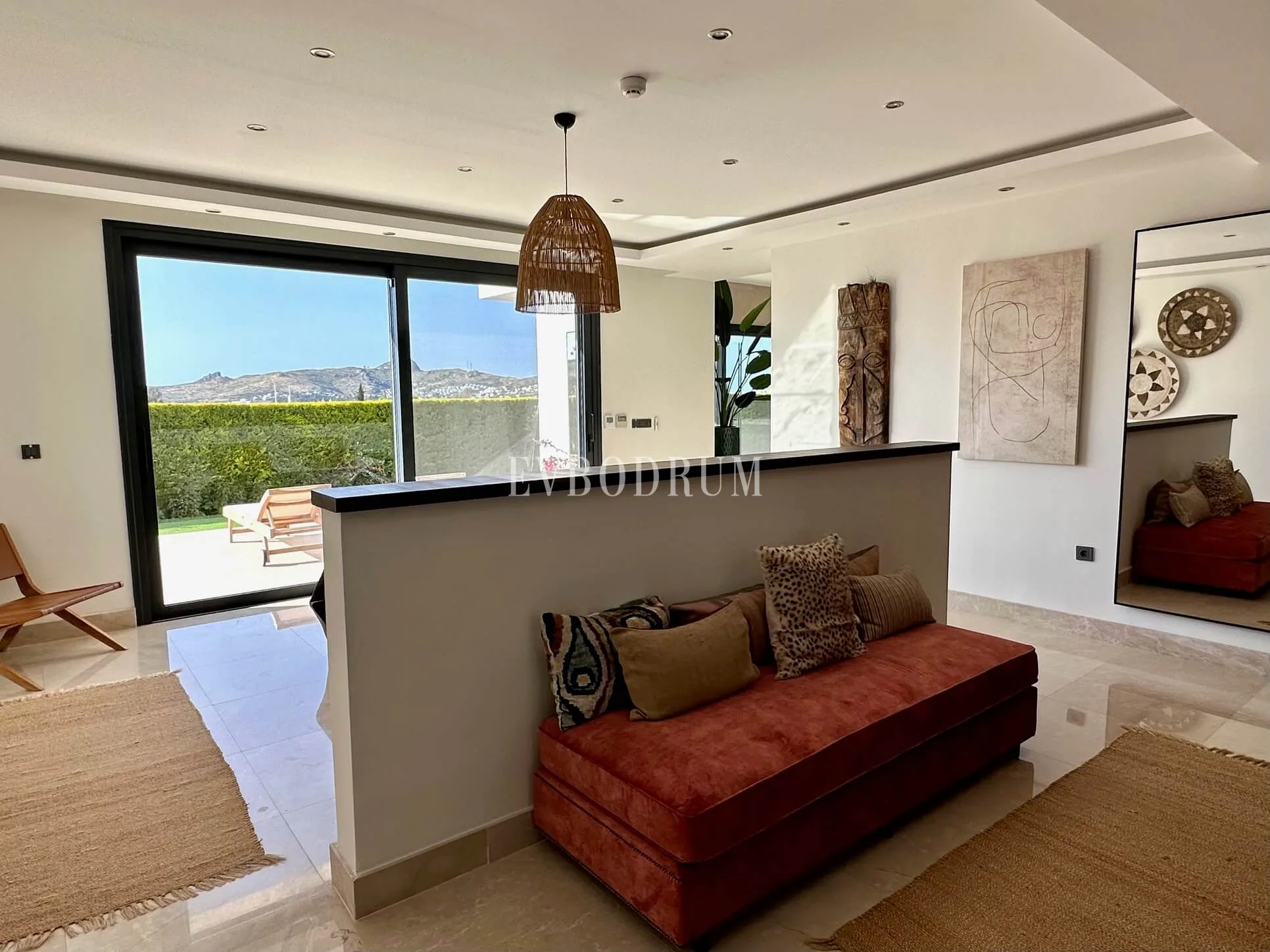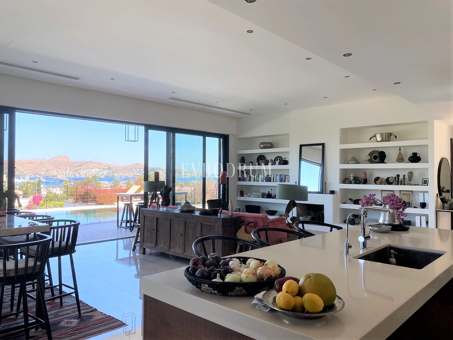 Açık plan tam donanımlı mutfak ve yemek alanı ile birleşen oldukça geniş bir oturma odası. Tavandan tabana pencereler teraslara, havuza ve bahçe alanına açılmaktadır.