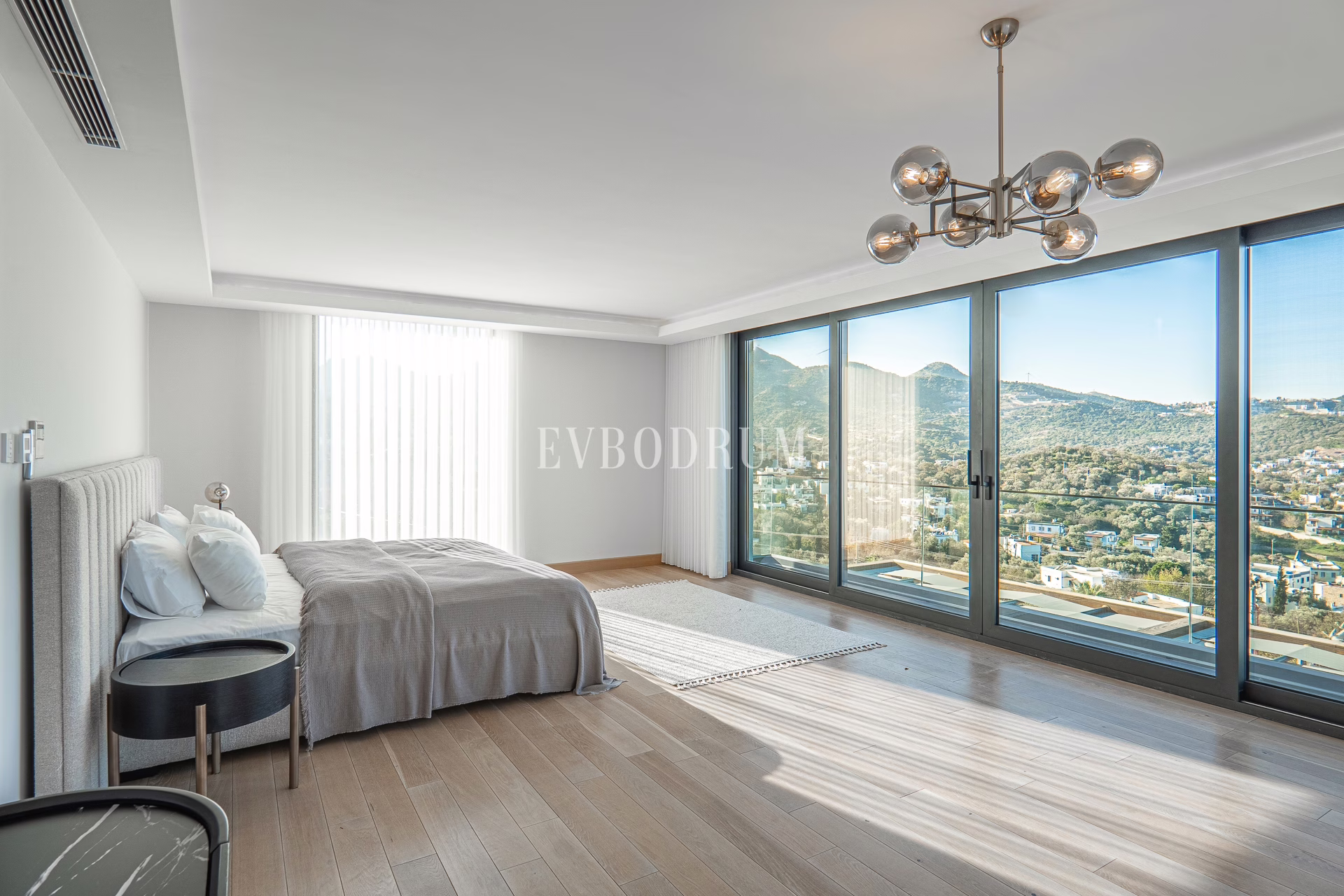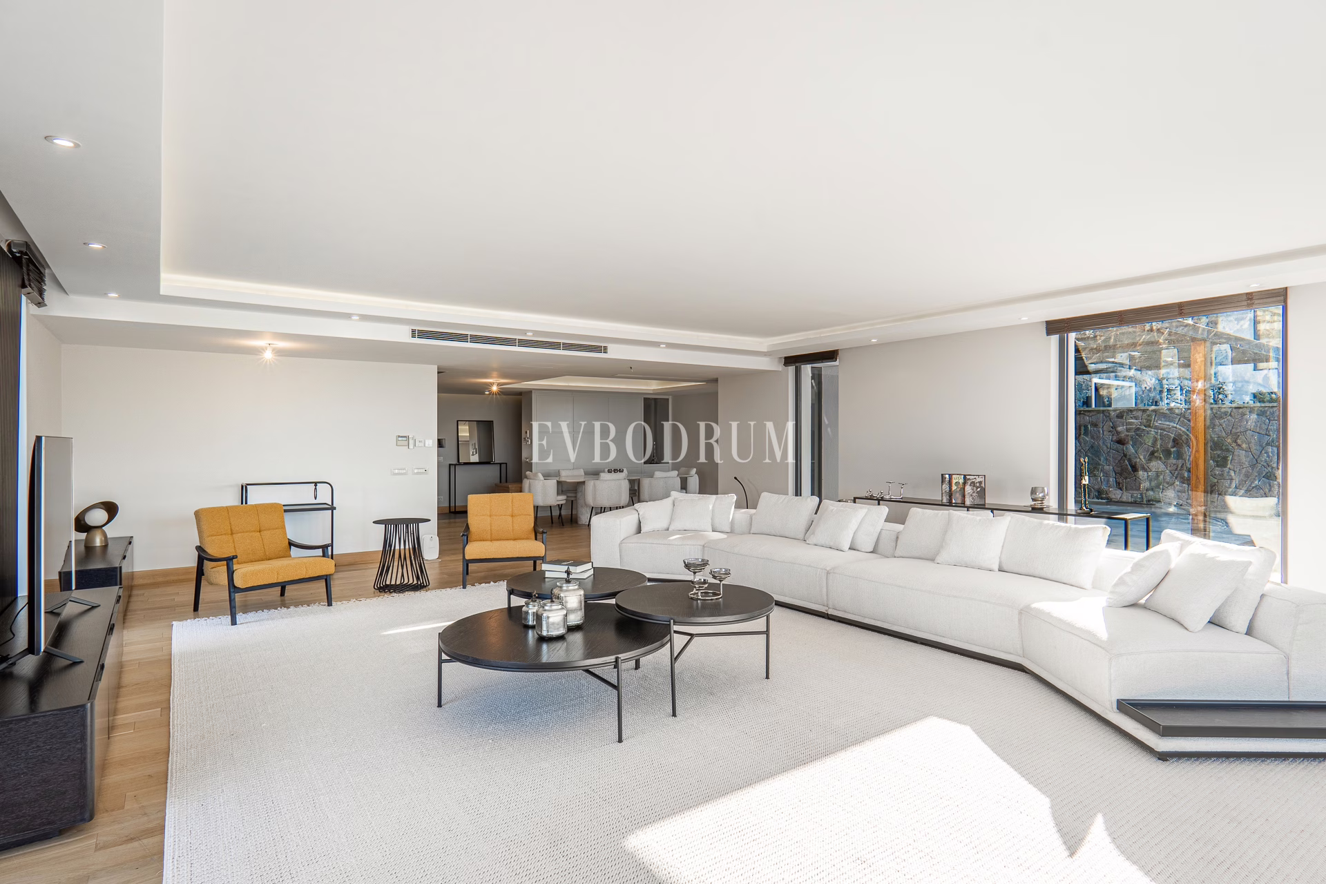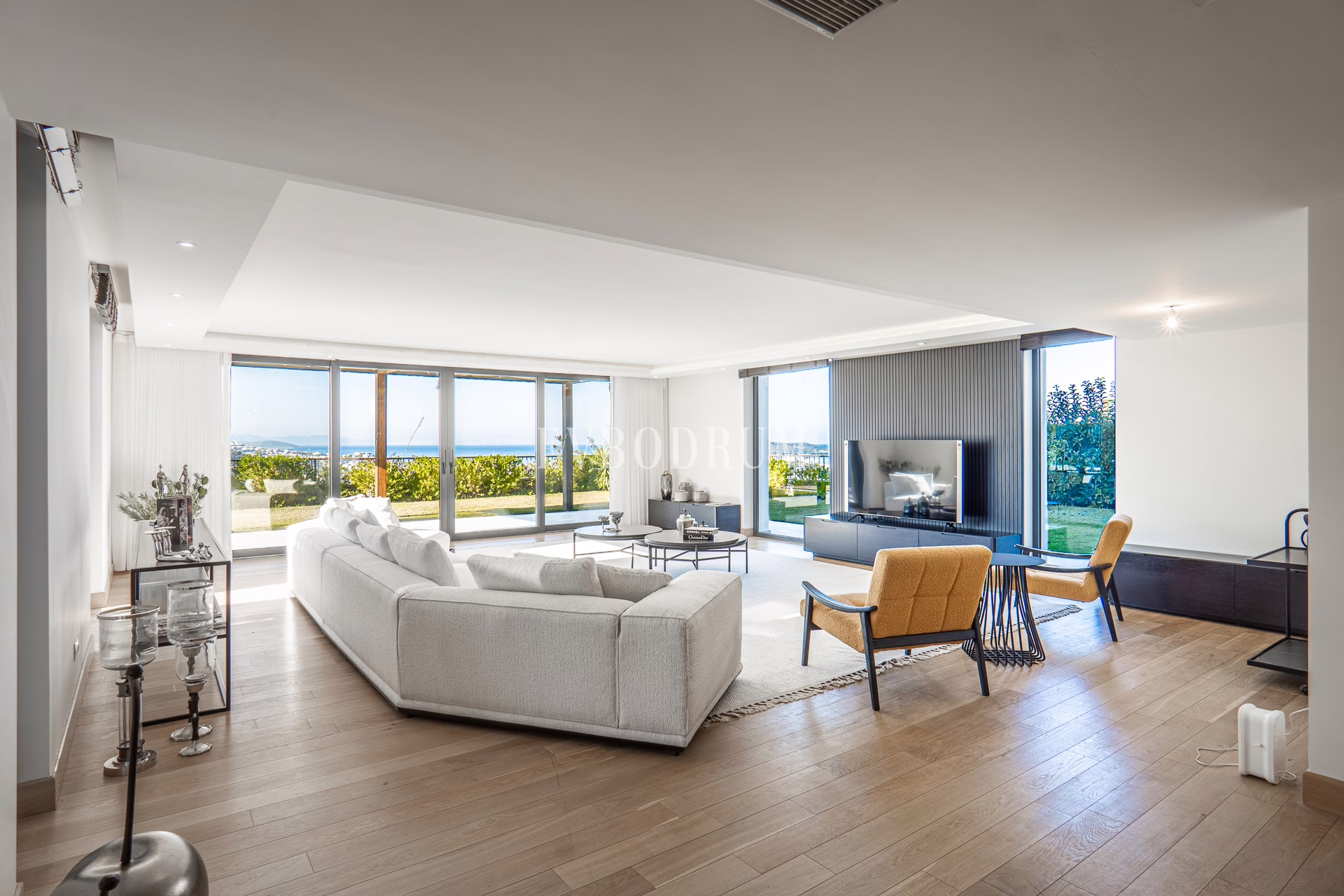 Kapalı ve geniş garajdan direkt girilen oldukça geniş salon, Yalıkavak Marina, koy ve harika gün batımı manzarasına bakıyor.