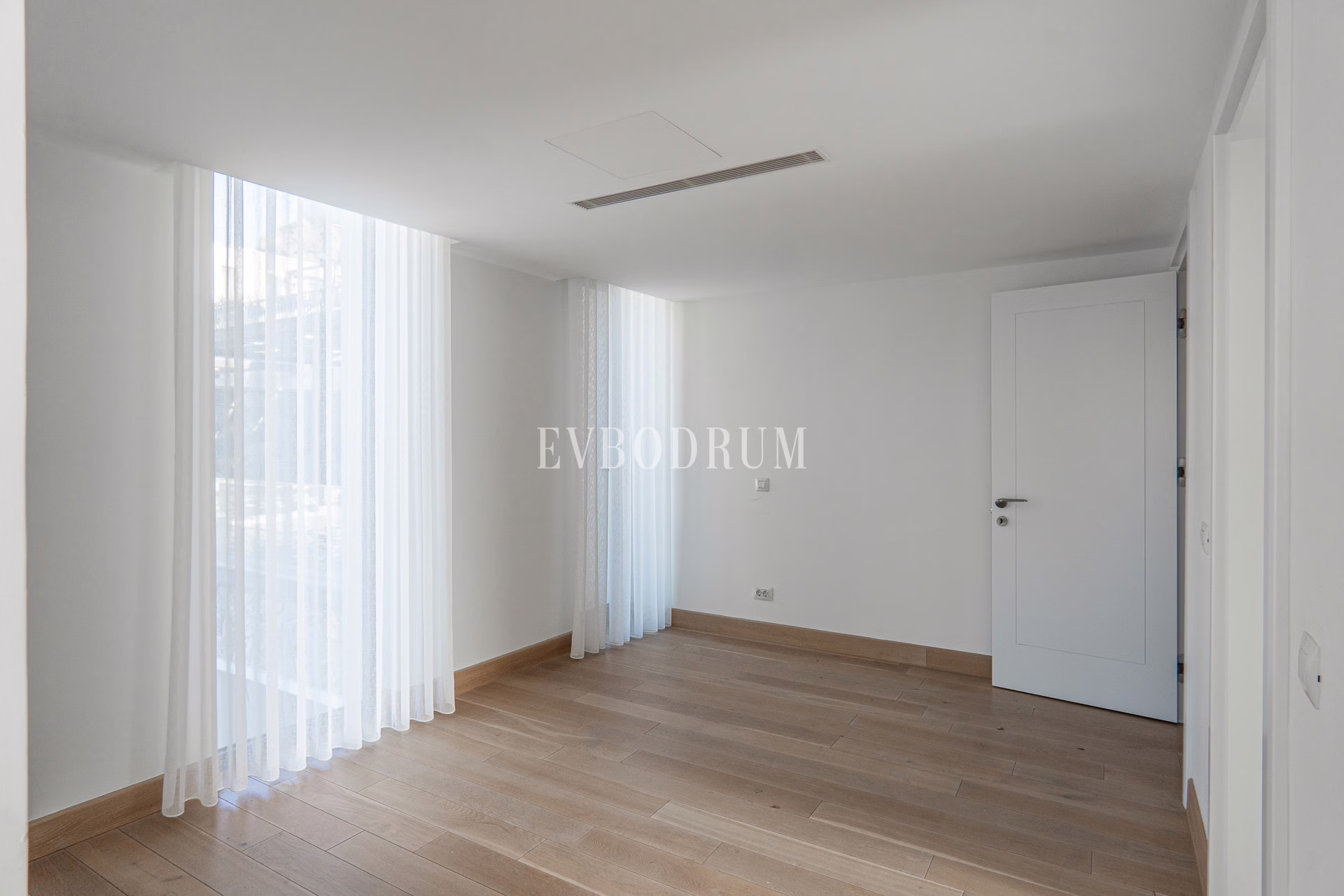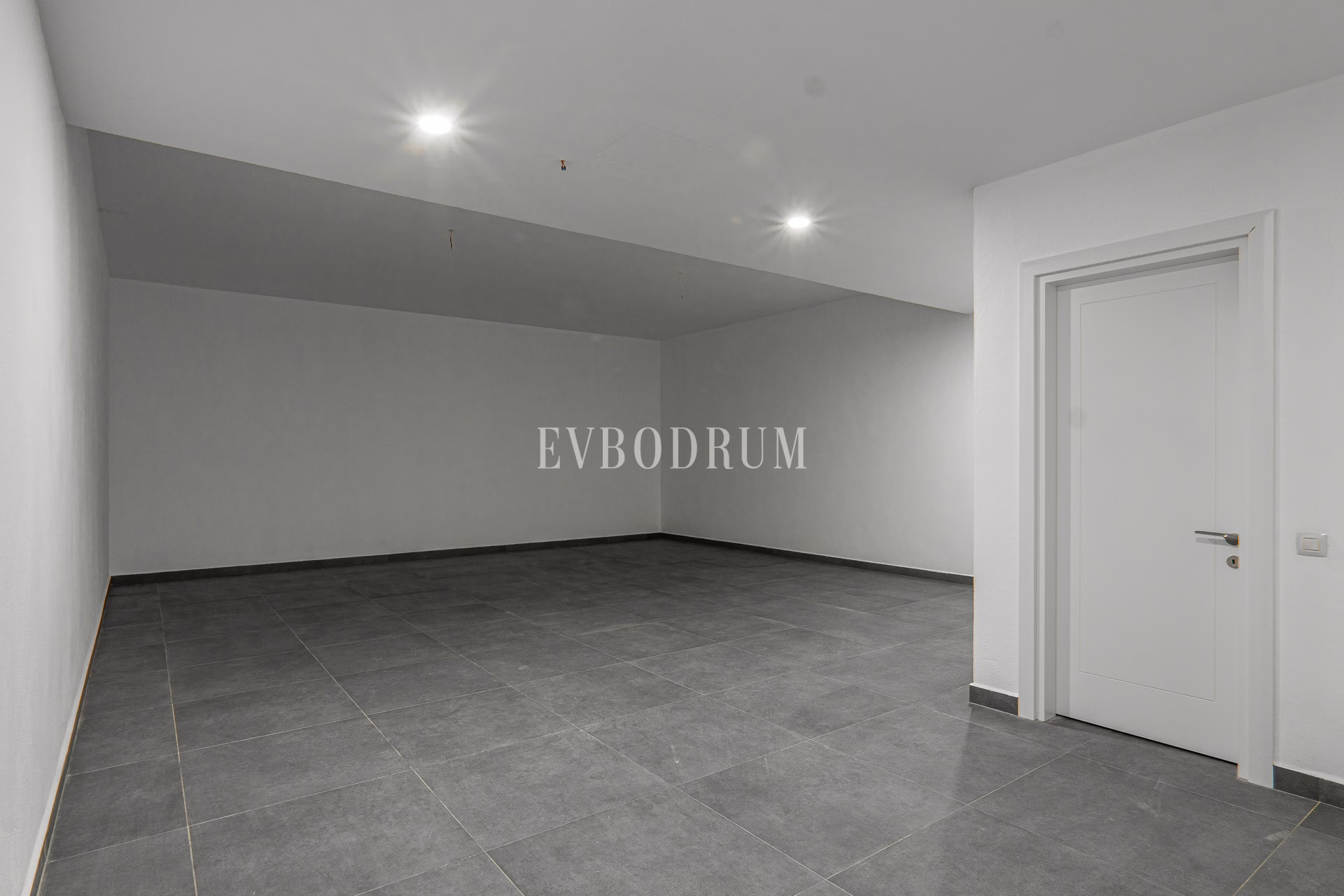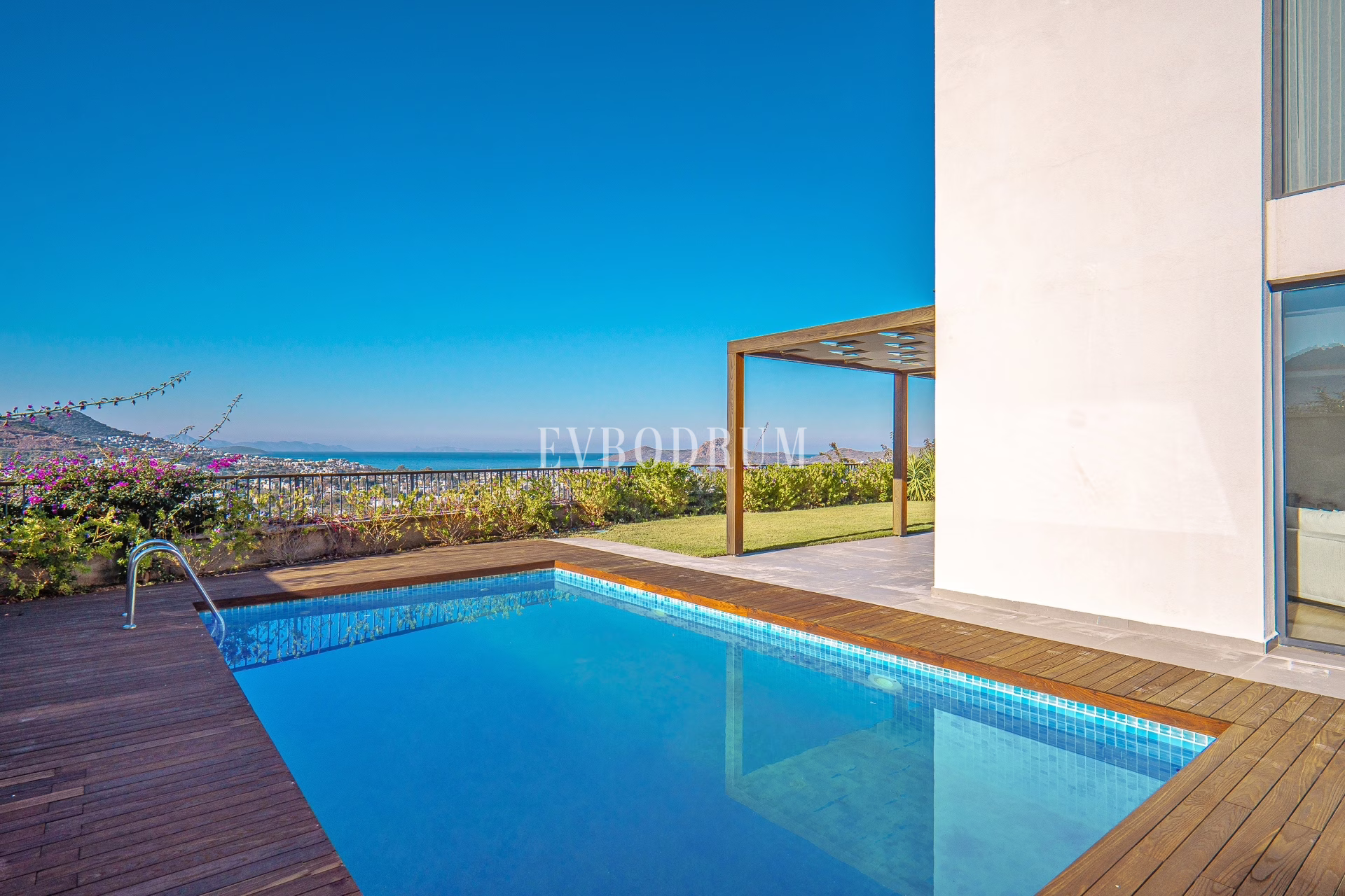 Kapalı ve geniş garajdan direkt girilen oldukça geniş salon, Yalıkavak Marina, koy ve harika gün batımı manzarasına bakıyor.