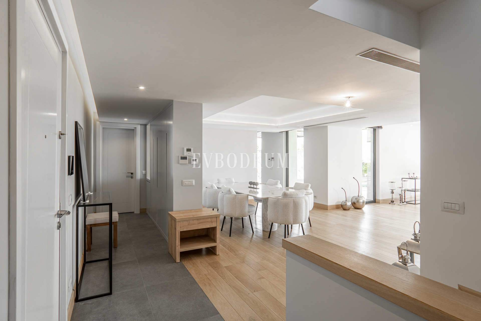 Ausgezeichnete Materialauswahl: Holzböden im Wohnbereich, Fußbodenheizung, integrierte Kühlung, Geräte der Marke Gaggenau.