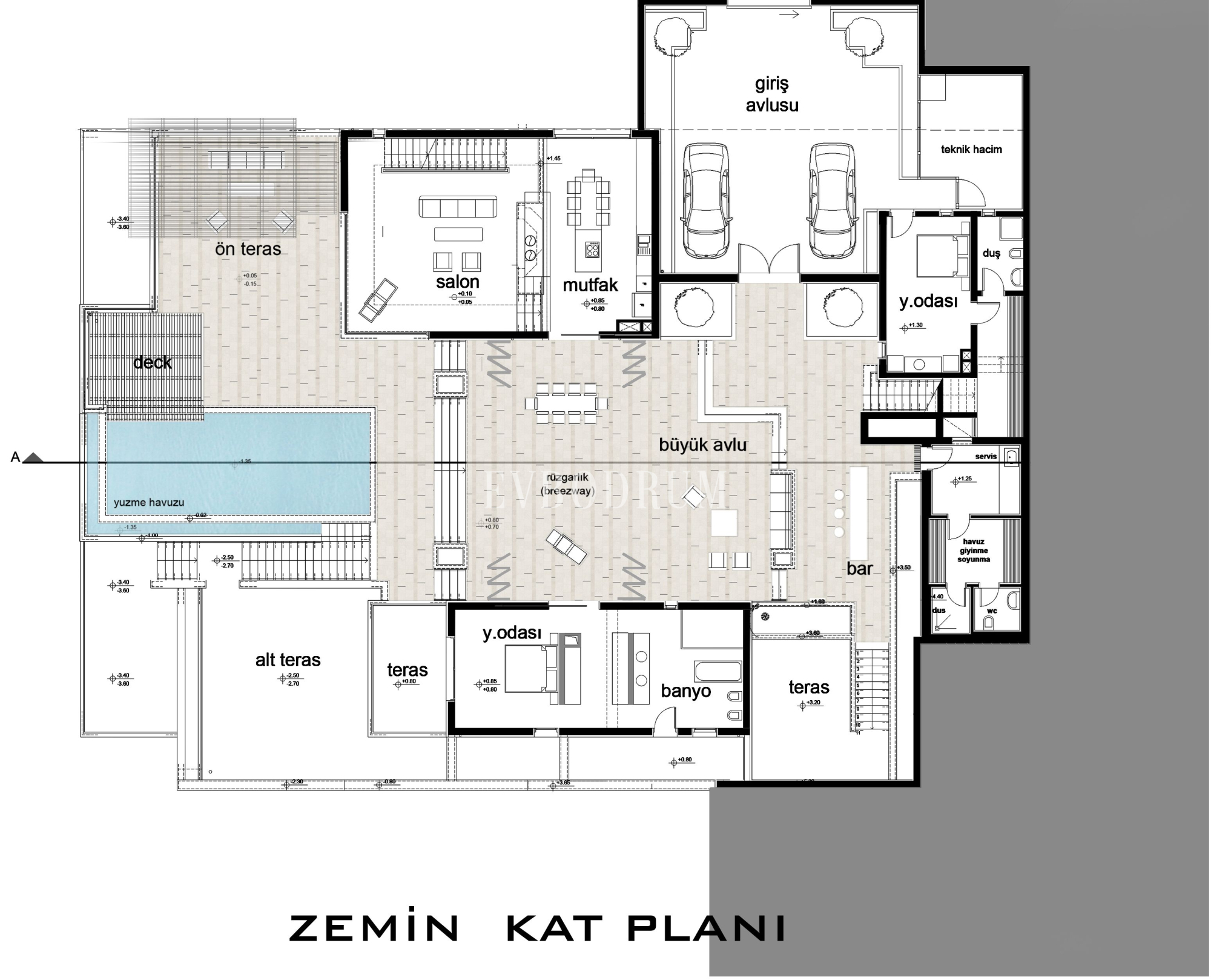 The large shaded atrium in the heart of the house offers outside catering, dining, bar, fireplace and pool functions, all integrated with the summer breeze and nature surrounding the villa’s hillside location.