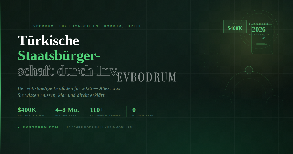 Dieser Artikel basiert auf den türkischen Staatsbürgerschaftsprogrammregeln vom März 2026. Investitionsschwellen, Bearbeitungszeiten und Compliance-Anforderungen können durch Präsidialdekret geändert werden – überprüfen Sie die aktuellen Regeln mit einem qualifizierten türkischen Anwalt, bevor Sie eine Investitionsentscheidung treffen. Dieser Artikel dient nur zu Informationszwecken und stellt keine Rechts-, Steuer- oder Finanzberatung dar. Evbodrum ist eine zugelassene Immobilienagentur. Wir sind keine Einwanderungsanwälte und geben keine Rechtsberatung zu Staatsbürgerschaftsanträgen.